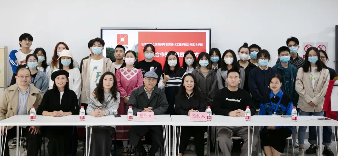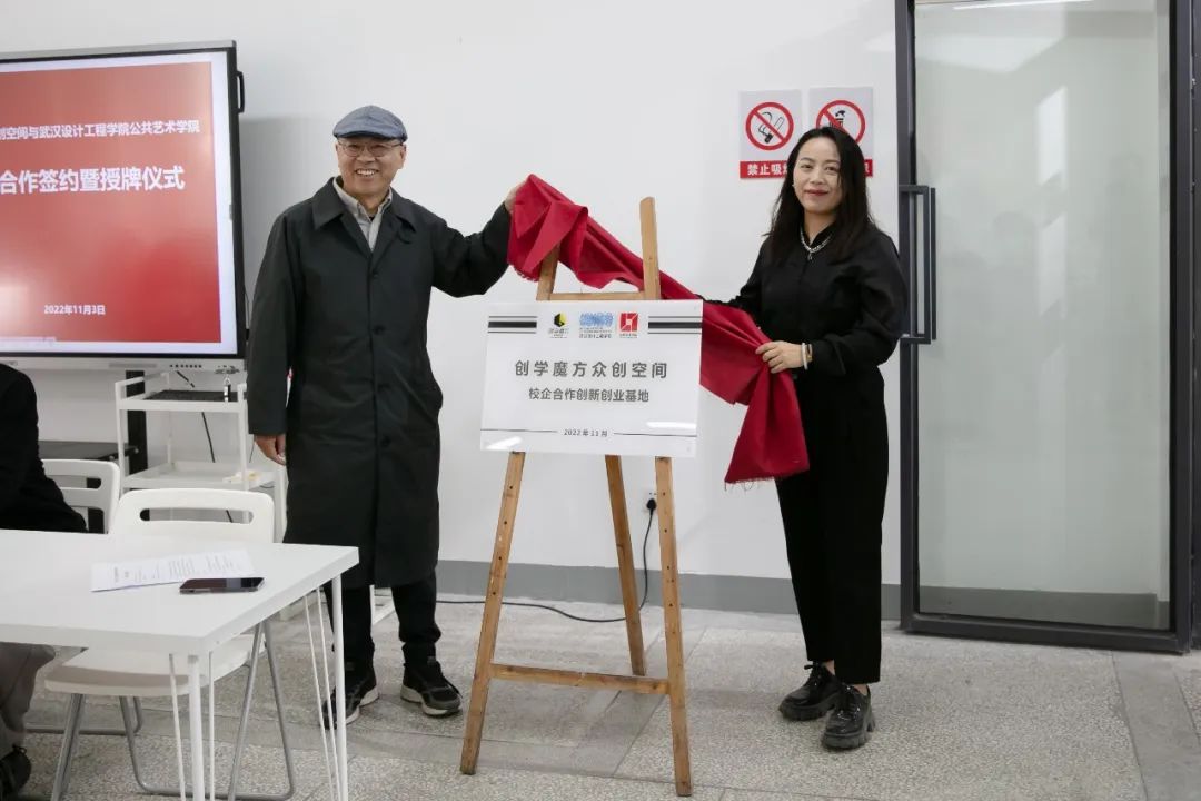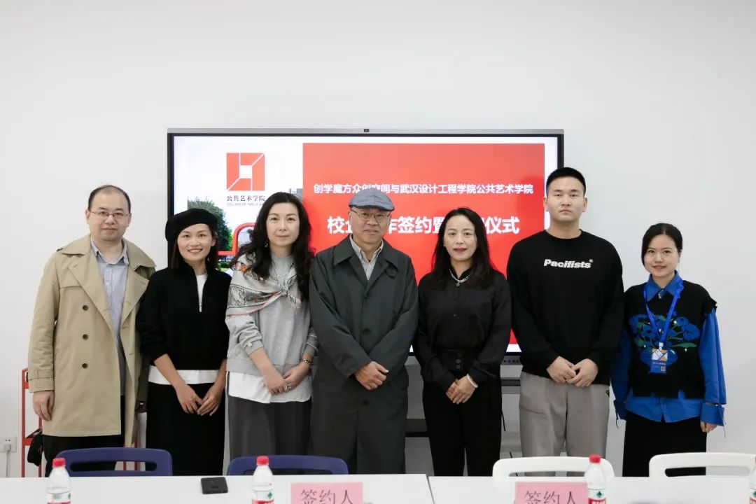 2022年11月3日,上午10点,武汉江夏区创学魔方众创空间与我院在九思楼2069进行了校企合作签约及创学魔方众创空间校企合作创新创业基地授牌仪式。yl6809永利集团院长谢跃、副院长吴茜、视觉设计系主任戴嫚、副主任郑璇、教师代表王纯、欧阳博及视觉专升本2202班全体学生与创学魔方众创空间董事长甘夏林、纸坊造文化公司代表邵帅、黄成共同出席了签约及授牌仪式。