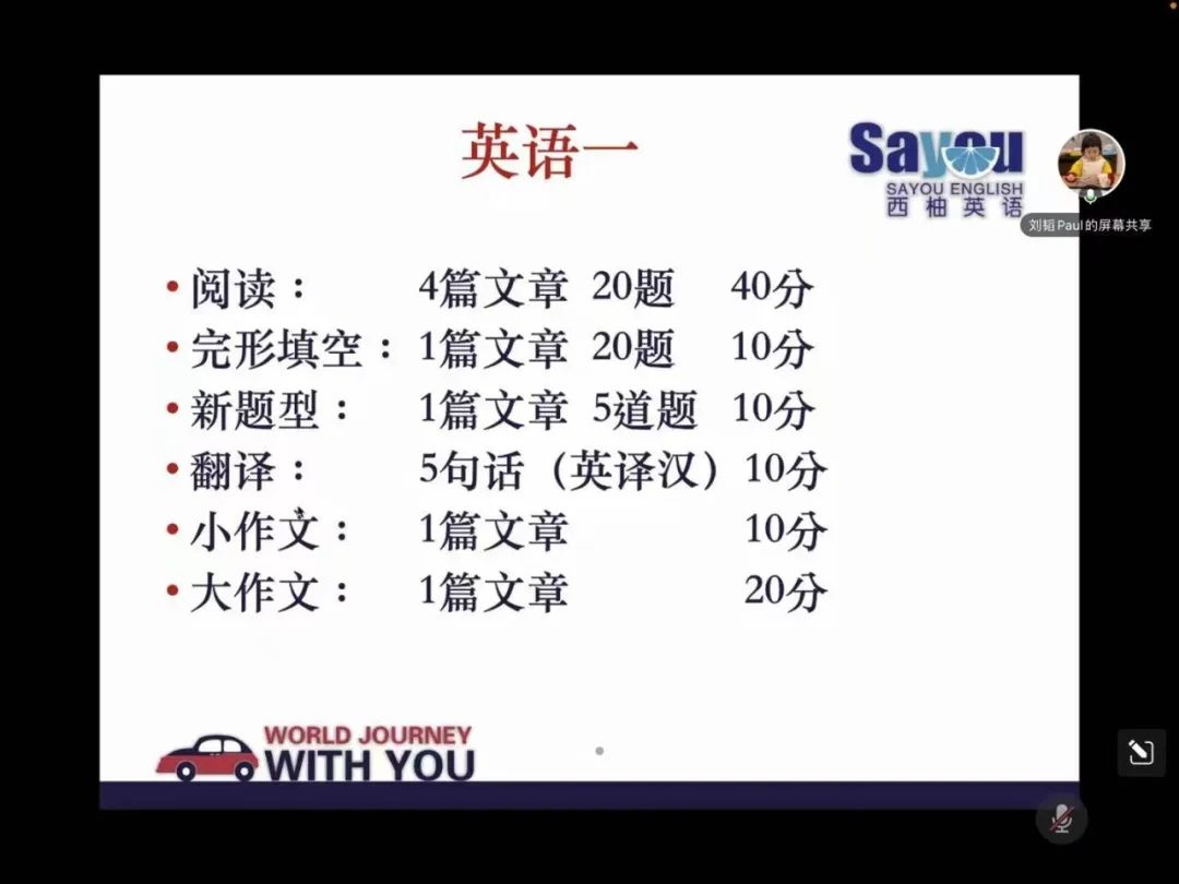 在分享会上,刘涛老师向我们介绍英语考研的一些事项。首先是英语考研的大致情况。英语考研总分是一百分,分为两种模式。考研优秀成绩在模式一里是70分,模式二里是80分。