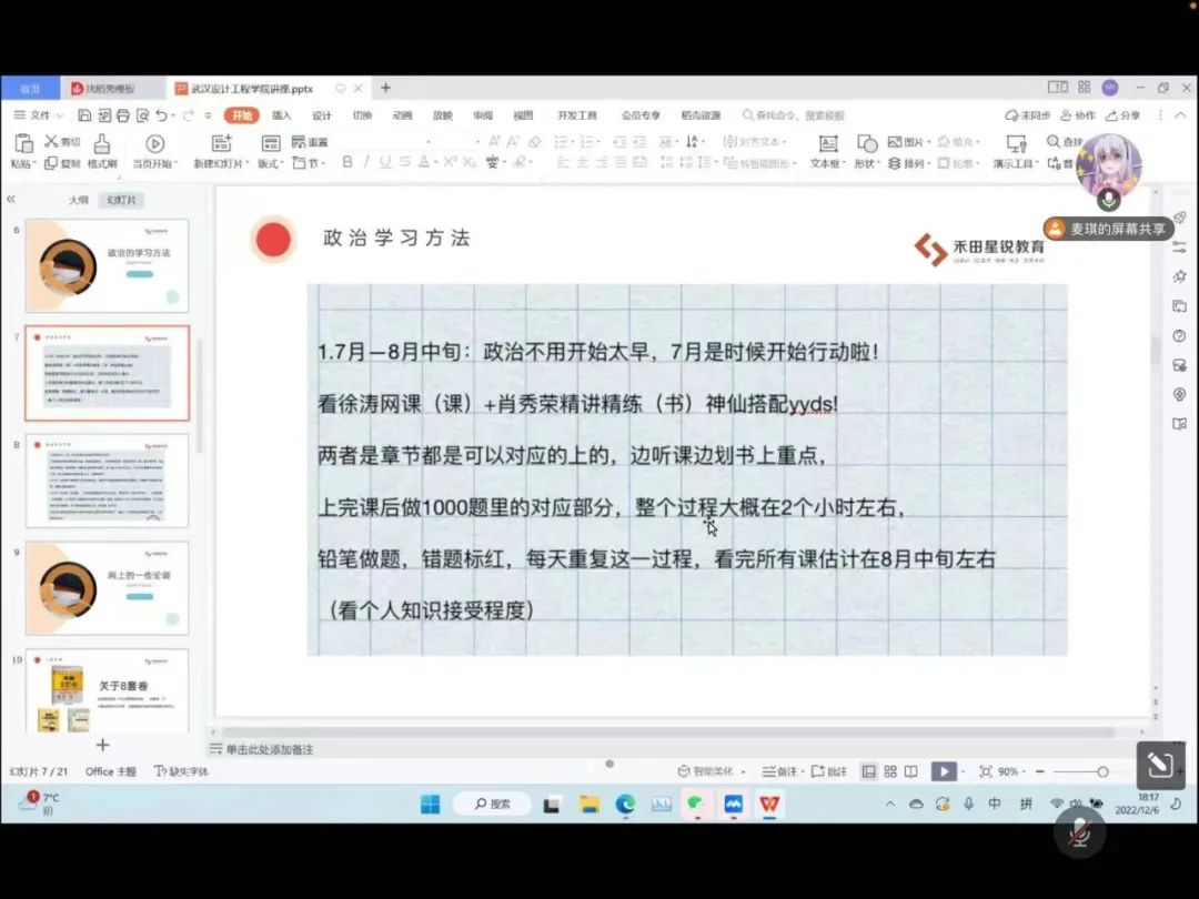 麦琪老师向我们分享了政治考研的心得。政治考研的准备应该在七月份,不必要太早,看徐涛的网课,刷肖秀荣精讲精炼是政治考研学习的完美组合。章节一一对应,重点可以一边听一边划。上完课开始刷题复习,做肖秀荣考研政治1000题,并进行错题整理分析,在8月中旬大多能结束课程。