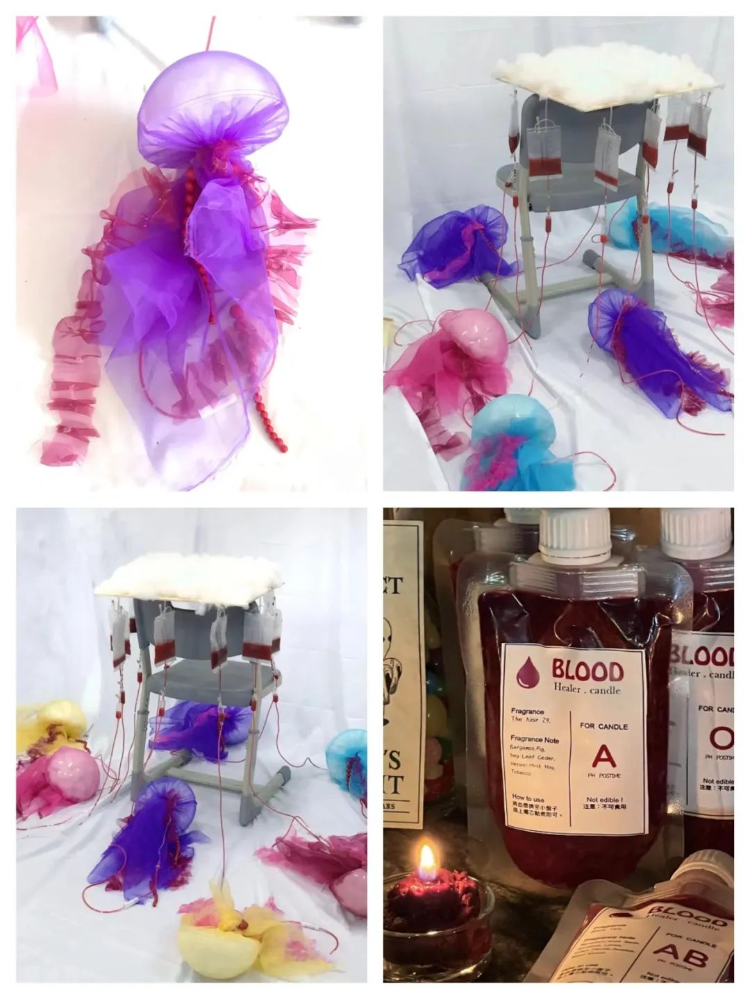 现在的学生压力越来越大像只会读书的机器,没了学生该有的青春活力。我们小组以水母为灵感做了一件实验艺术装置,作品的初心是希望有更多的人重视学生压力很大。水母本应该是梦幻的灵动可爱的,但是被输液袋吊着,没有活力垂死挣扎。比喻压力大的学生,被老师家长学校等等灌输要拼命学习没有办法释放自己。