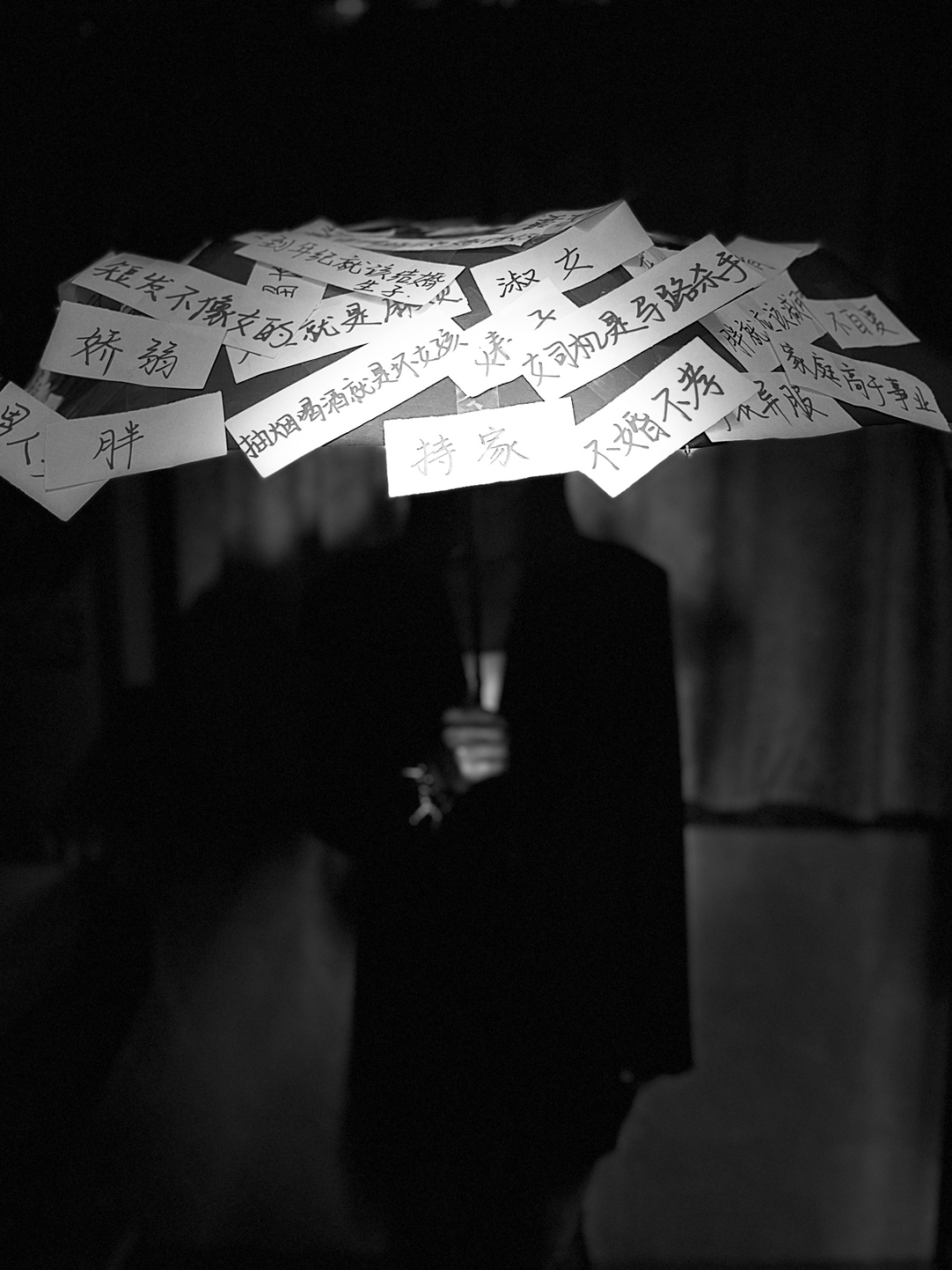 《保护伞》:面对人们和社会给予的种种标签,女性不得不撑起一把保护自己的伞,以抵挡住外界贴于女性的标签,在伞内她们才能做回自己喜欢的样子。