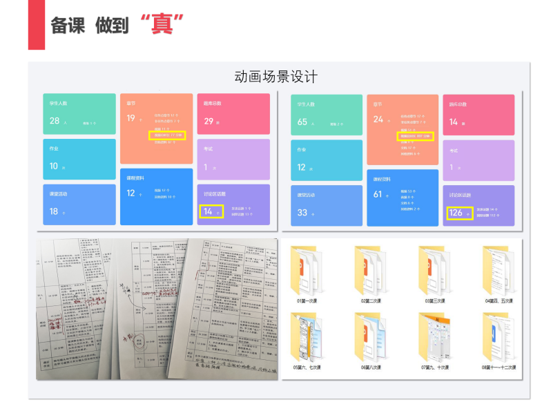 一年一备课:每年更新教学案例,以主讲课程《动画场景设计》为例,课程的备课数据——视频资料的总时长从最初的77分钟累计增长到807分钟,线上讨论话题从最初的14个扩充到126个。