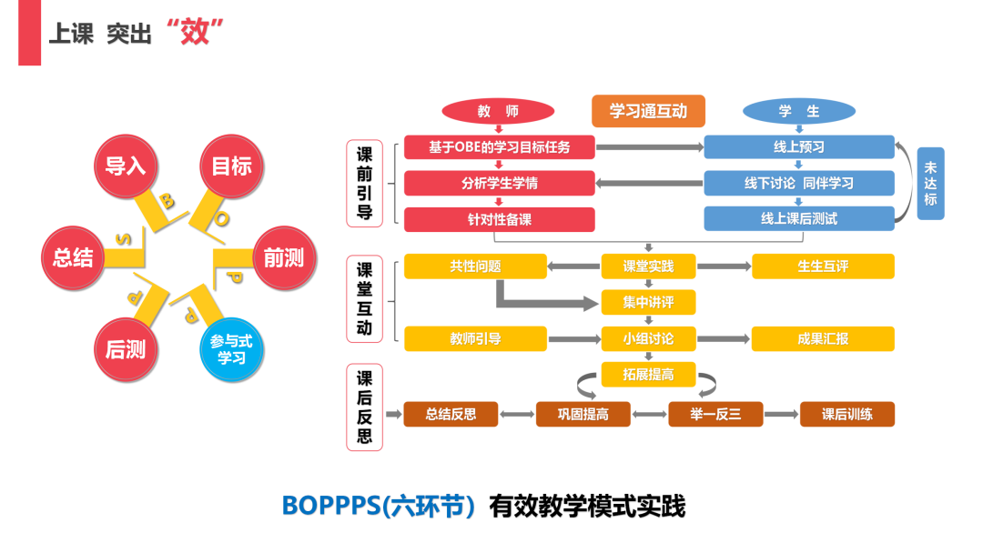 2.上课突出“效”。走过了站上讲台到站稳讲台的历程,孙蕾老师已经步入站好讲台的阶段,孙蕾老师的课堂教学定位从有趣、有料转变为有效。在教学中,孙蕾老师尝试运用BOPPPS有效教学模式,基于导入、目标、前测、参与式学习、后测、总结6个环节进行教学设计,其中特别注重参与式学习,通过课前引导、课堂互动、课后反思,引导学生全程参与线上线下混合式互动。运用多种形式的预习、讨论、测试、汇报、互评、反思、实践等,强化学生在教学活动中的主体地位。