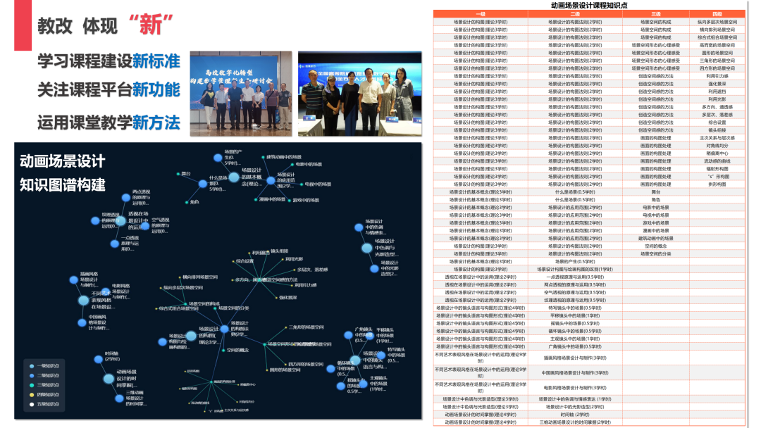 4.教改体现“新”。为不断提升课堂教学质量,孙蕾老师持续学习课程建设新标准、关注课程平台新功能、运用课堂教学新方法,在《动画场景设计》课程中,孙蕾老师尝试了知识图谱的构建,将知识点分为4个层级,与每次作业形成知识点关联,以观测学生的学习情况。