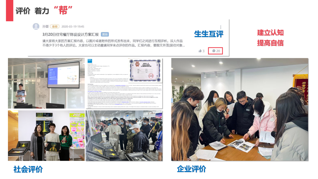5.评价着力“帮”。教学评价对于教与学都至关重要,是后期课程建设的重要指引和参考。孙蕾了老师通过教师点评、生生互评、社会评价、企业评价多元形式,在课堂上、展览上鼓励学生大胆展示自己的设计思路,接受不同人群的评价,帮助其建立客观认知,提高专业自信。