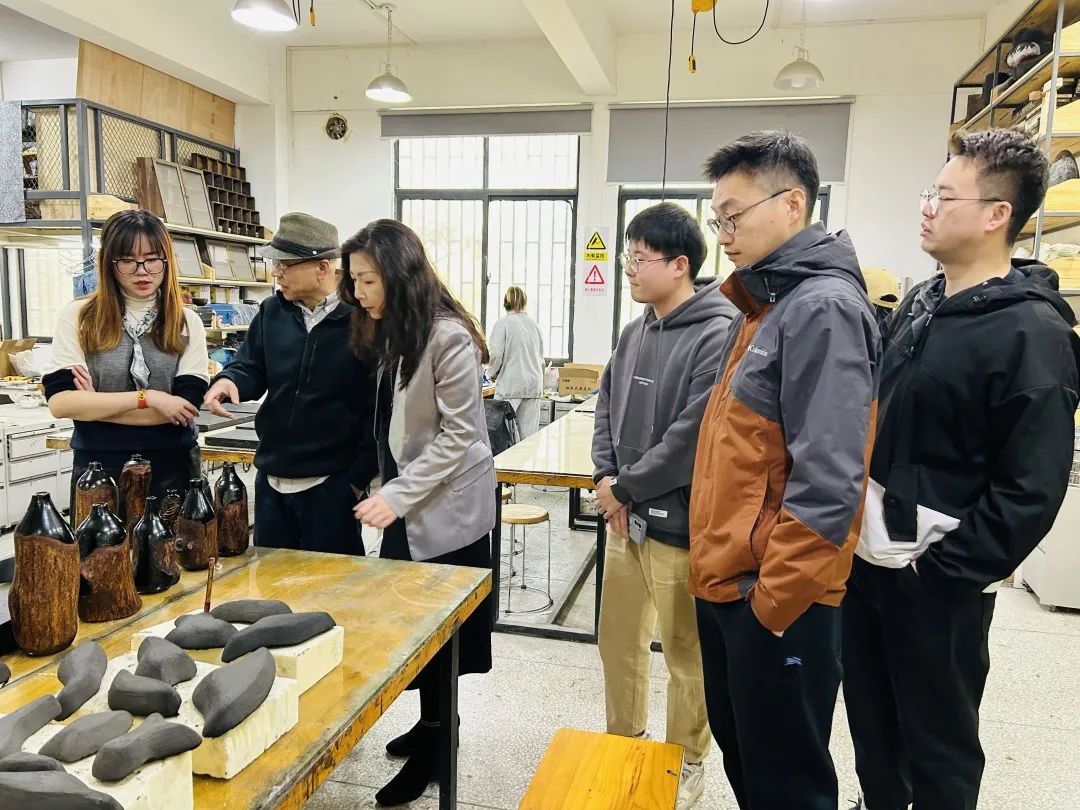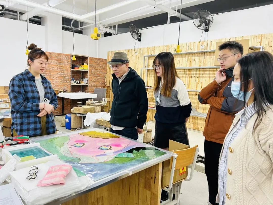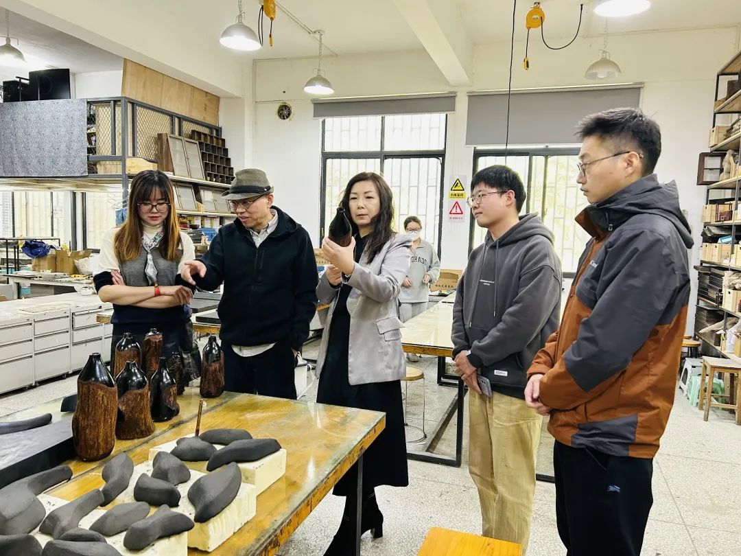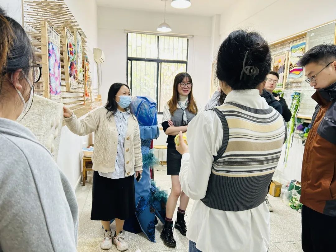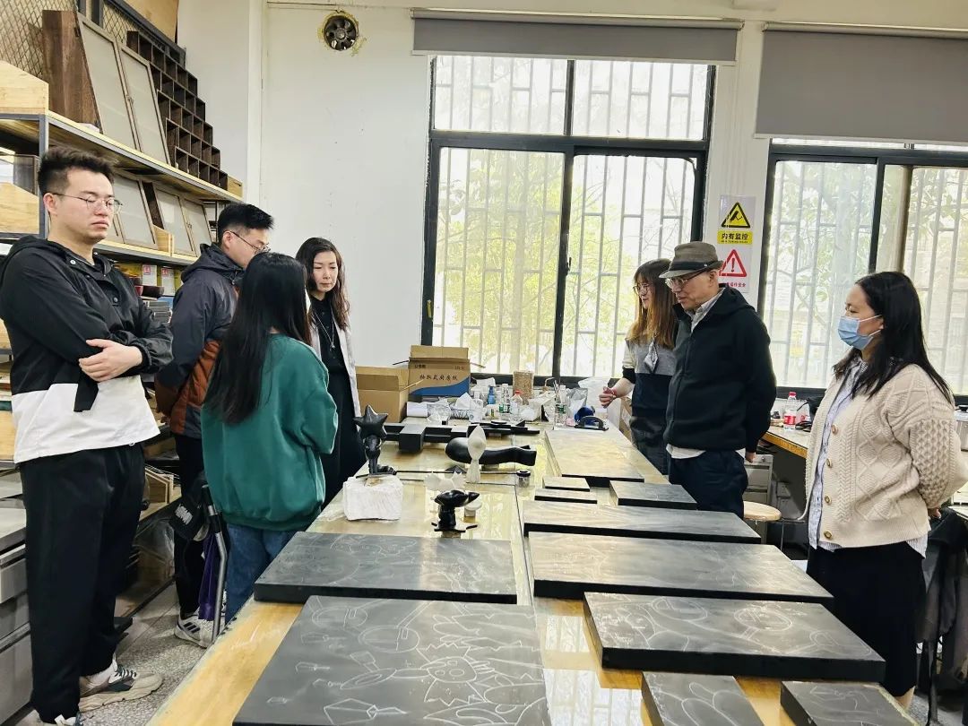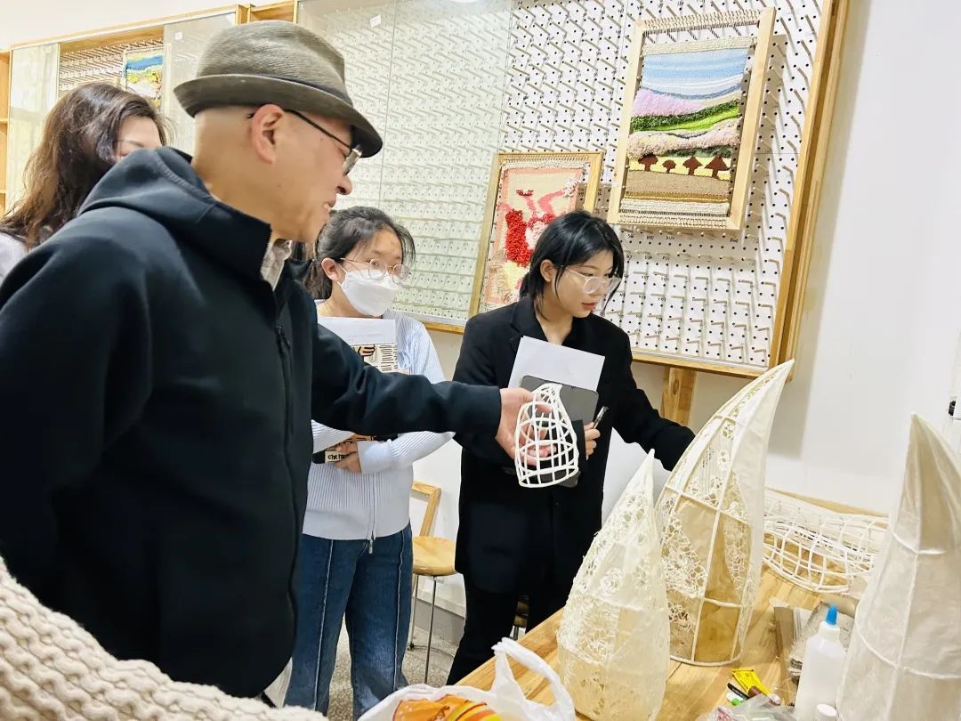 检查小组从陶艺、综合材料、漆艺和纤维艺术四个方向对各组的毕业生进行了详细的情况了解,在现场检查了同学们的创作实物,并听取了同学们的制作过程汇报,在综合课题选题内容后,给予了指导意见。