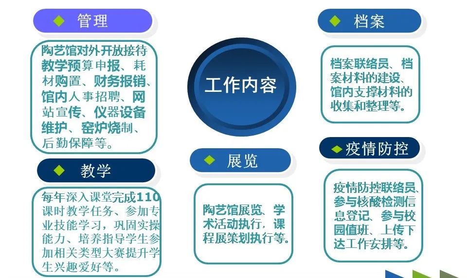 在教学管理中,馆内每一门课程开始之初,徐娟老师都会根据课程的课程目标、课程规划与其他教师沟通,尽量配合及服务课堂安排,为每门不同的课程制定具体措施。除此以外,馆内的日常教学及针对陶艺方向毕业生使用馆内进行毕业创作,都会合理安排馆内空间使用,科学有效地规划区域管理及对高危仪器设备张贴提示标语和登记记录。