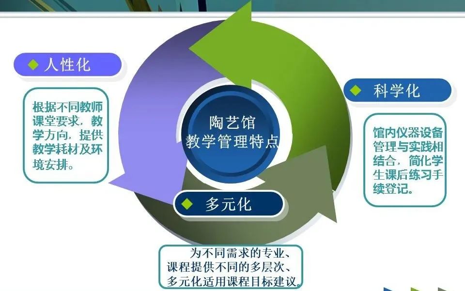 徐娟老师针对陶艺馆教学管理特点,归纳出3个关键词:人性化、科学化、多元化。这3个词也是徐娟老师一直以来的工作方向标,人性化是指根据不同教师课堂要求、教学方向、提供教学耗材及环境的安排;科学化是指馆内仪器设备管理与实践相结合,简化学生课后练习手续登记;多元化是指为不同需求的专业、课程提供不同的、多层次、多元化适用课程的目标建议。