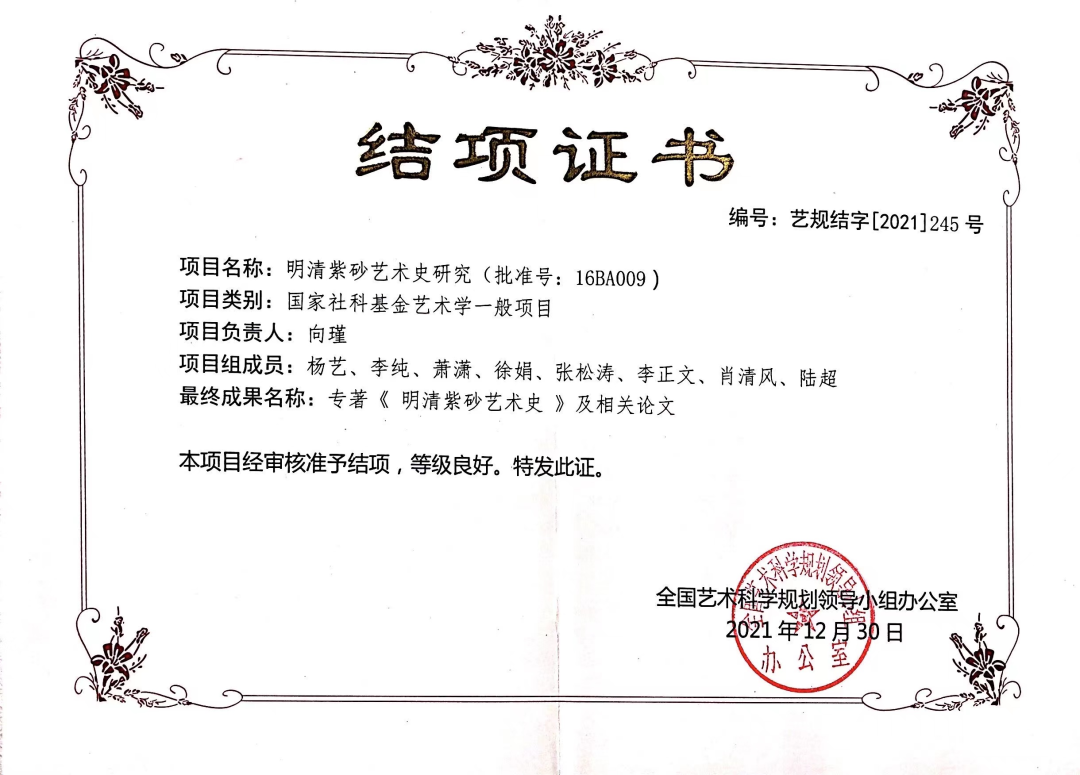 (3)2016国家社科基金艺术学一般项目. 明清紫砂艺术史研究(BA16009). 2016.8-2021.6. 5/9