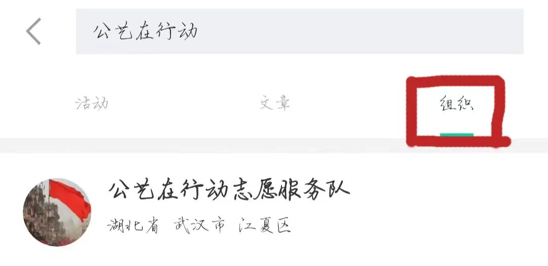 第三步,输入“公艺在行动”,点进去加入组织即可