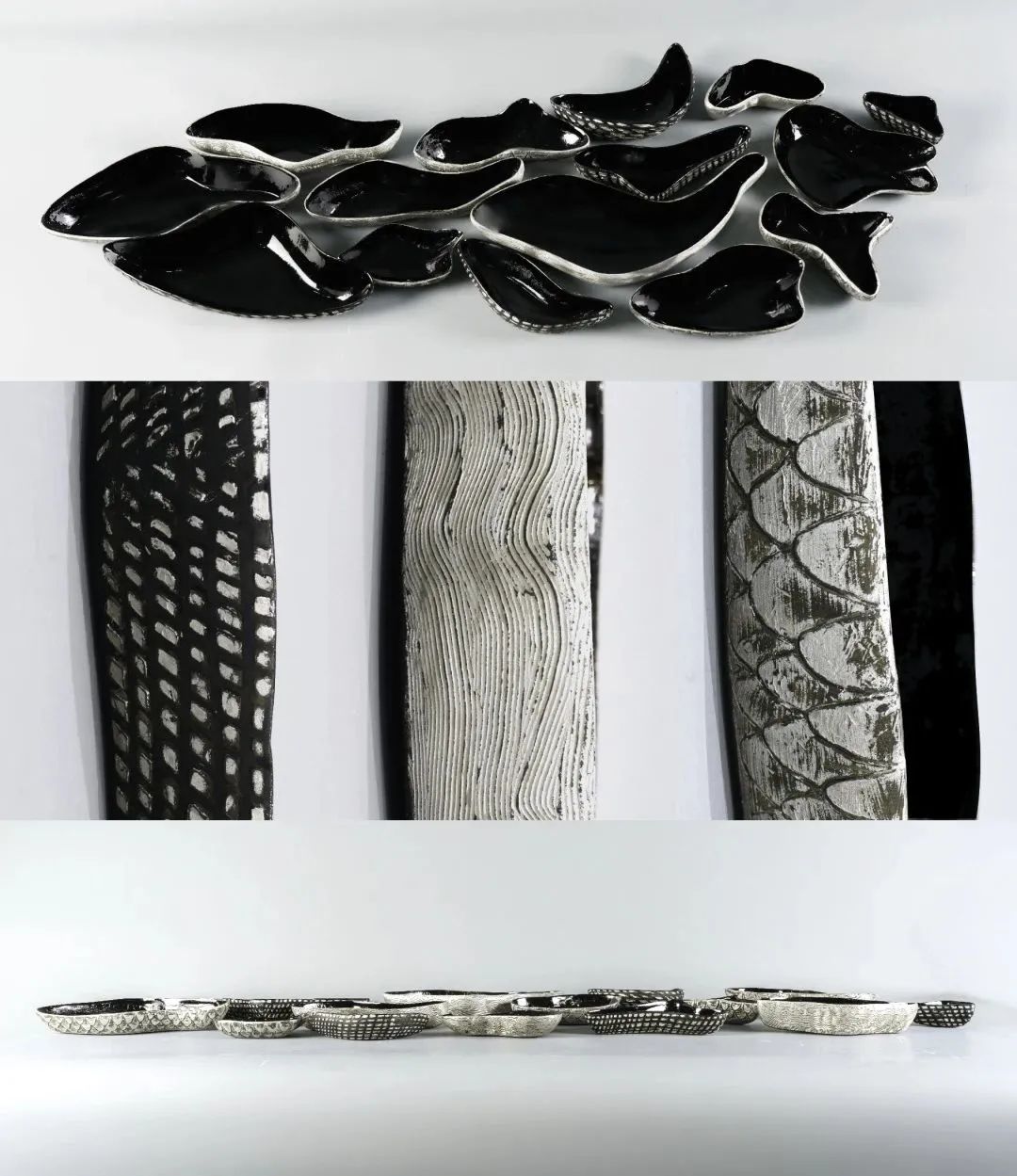 《游·戏》以长江流域的15种鱼类为造型来源并进行抽象仿生设计,器型制作中使用传统脱胎工艺——以苎麻与漆灰成型。装饰饰以仿鱼鳞的效果,作品组合表现阴阳相协与万物生生不息的创作理念。