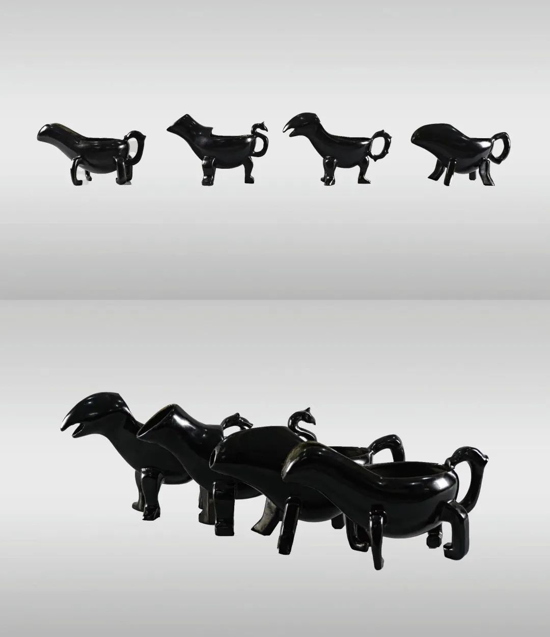 《祥瑞》以古代青铜匜为设计原型,融合中国传统“四象”观念,制作出四件造型夸张的“匜”,制作采用了漆艺脱胎工艺与木工雕刻,以苎麻、漆灰、木成型。作品造型在夸张变形中寻求中国传统造型形式、内涵的延续与衍生。