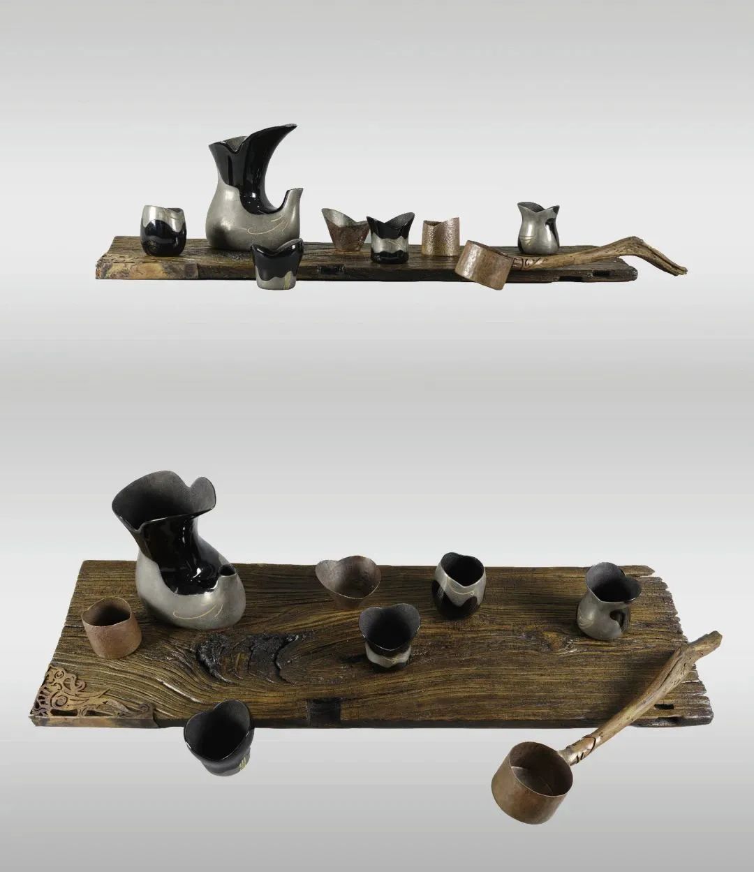 作品《礼·觞趣》的创作灵感来源于青铜酒器,通过运用脱胎工艺和金属锻造工艺的结合,将具有现代感的金属材料引入漆艺中,使漆艺作品既有传统的工艺加工手法,又有符合当下审美的艺术形式,增加了漆器的形式美及漆器的表现力。