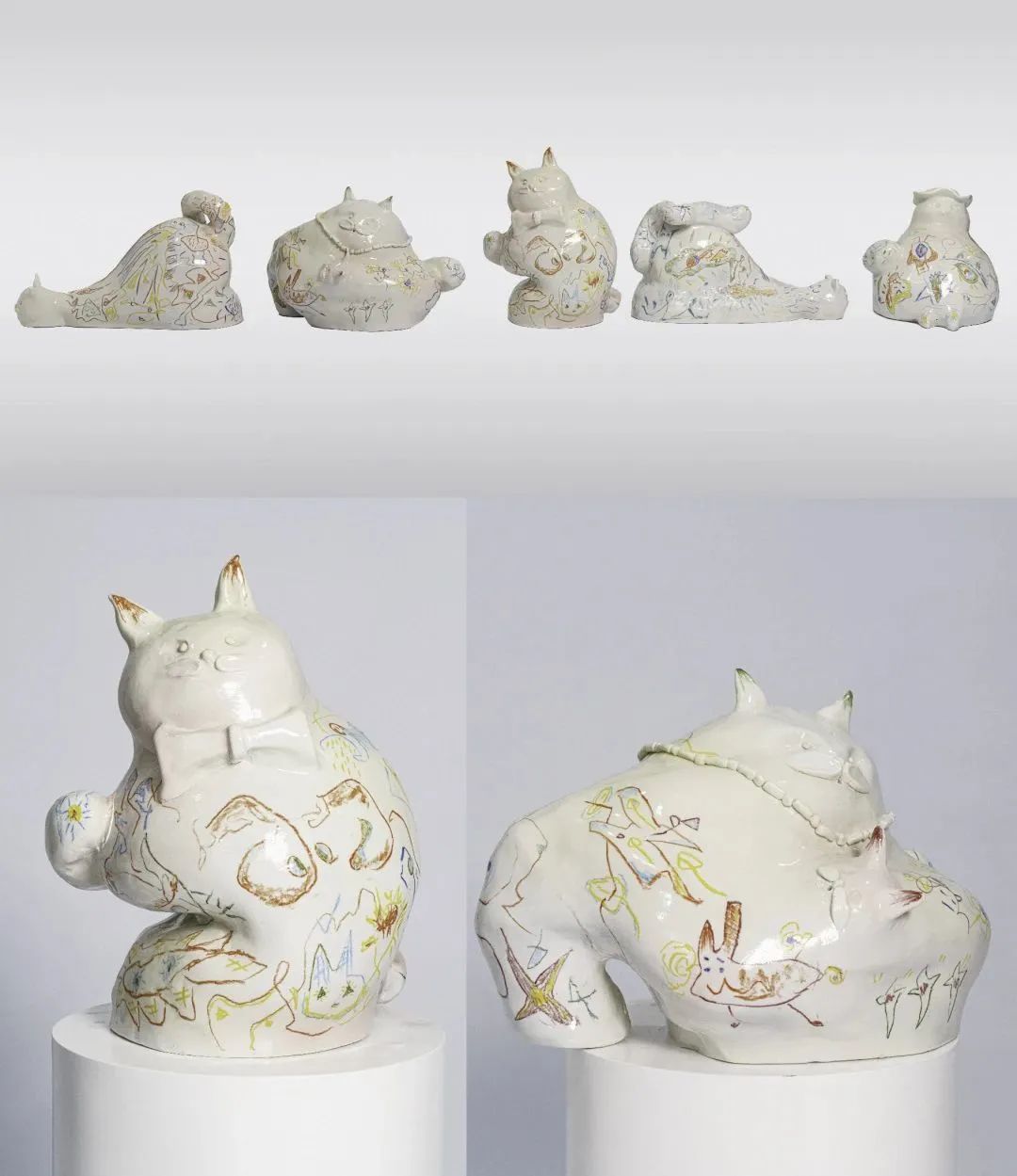 当今社会的快节奏使得人们的工作和心理压力不断变大;疫情下的社会人们深感生命的脆弱。宠物往往成为我们不良情感的解药,情绪性的绘画成为我们释放压力的一种方式。作品猫咪形象与陶瓷釉面装饰结合,探索符号背后的情感表现和真情实感,希望展现自身对缓解健康焦虑情绪,治愈心灵的人文关怀。