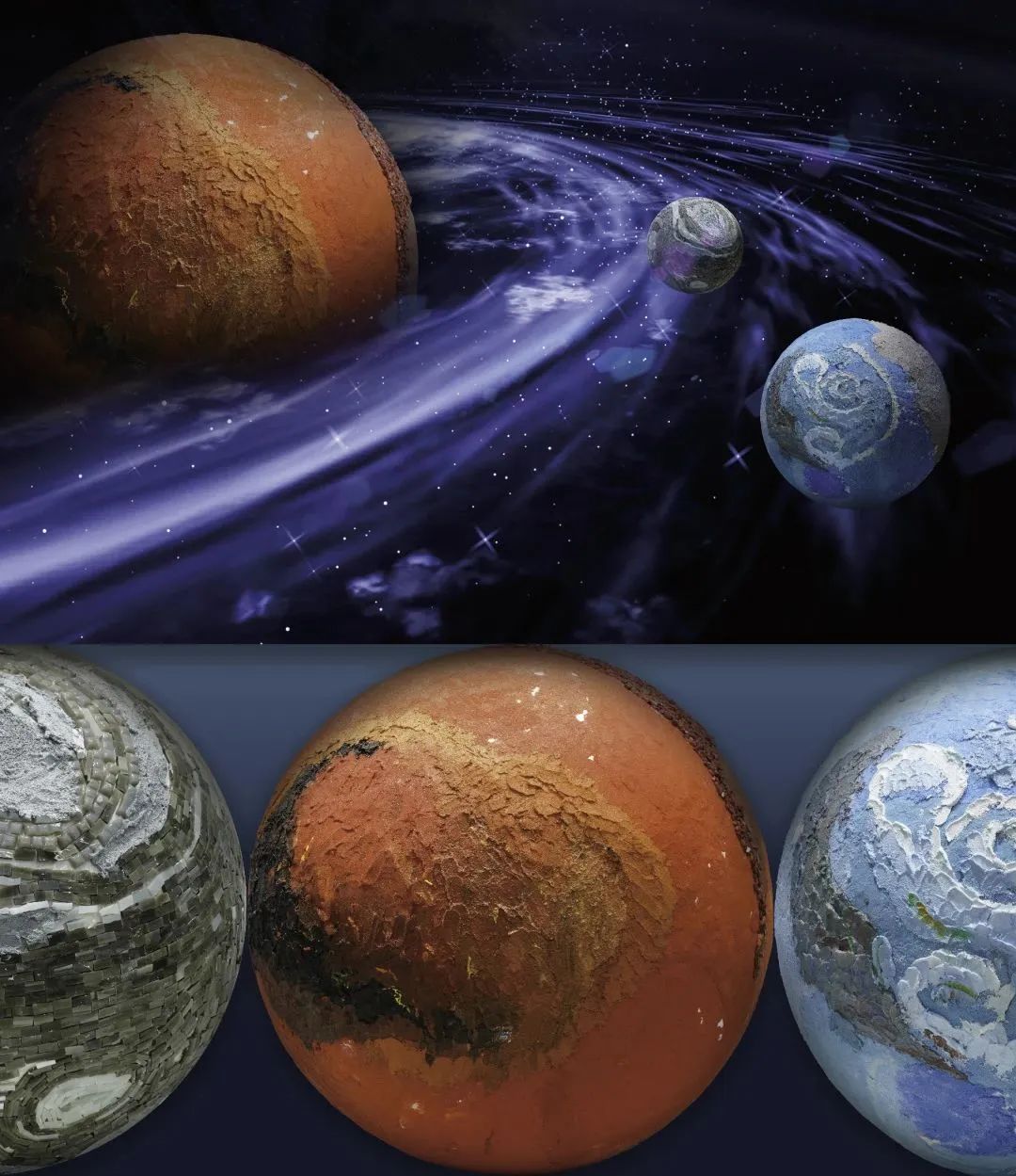作品《流浪地球》灵感来源于太阳系中的火星、地球、月球三大行星,其作为现在与人类最密切相关的3大行星。当人们赖以生存的地球受到陨石的破坏,人们该何去何从?在人类不断探索宇宙的奥秘当中,一直忽略了地球的环境保护,希望通过此作品,呼吁大家在不断探索未知事物的同时,也要保护好我们家园。