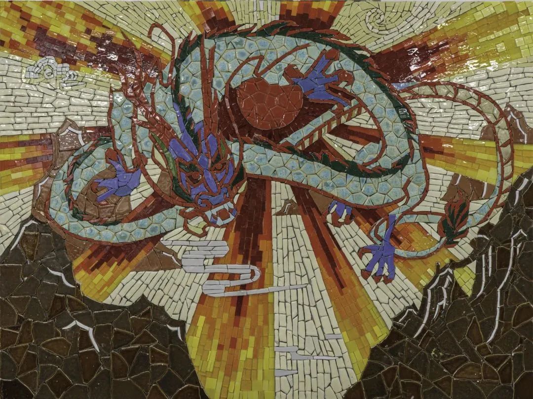 九霄龙吟惊天变,风云际会潜水游。作品《九霄》运用综合材料镶嵌工艺,描绘出中国民间神话故事。在神话故事里,龙是一种神异动物。古籍记载:龙,鳞虫之长。能幽能明,能细能巨,能短能长。春分而登天,秋分而潜渊。《九霄》代表着无所畏惧的勇气和所向披靡的精神,寓意着强大的力量。