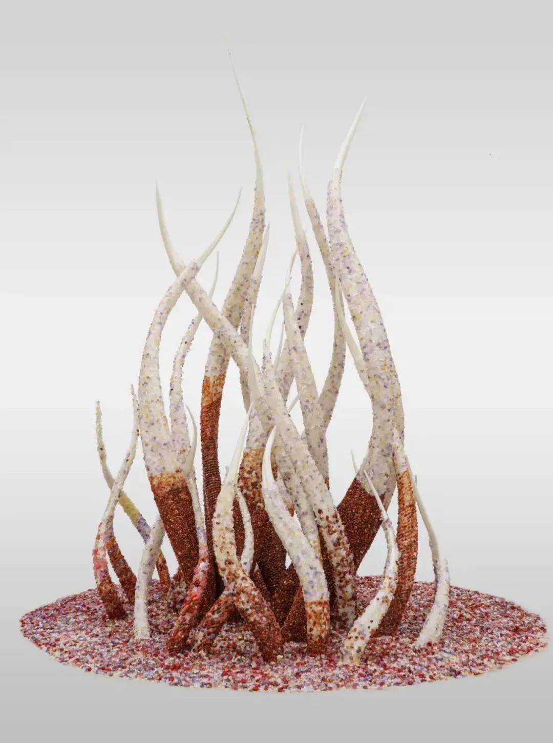 绛树无花叶,非石亦非琼。世人何处得,蓬莱石上生。《瑞宝》灵感来源于海洋生物—珊瑚,基于珊瑚的外观进行设计创作,将马赛克镶嵌工艺与天然水晶矿石材料相结合,营造一种置身于海底世界的视觉效果。生态环境与人类密切相关,在人类社会的各个发展阶段,人类活动都会对生态环境产生影响。不合理的活动使环境负载超过了生态系统所能承受的极限,生态平衡遭到破坏,导致生态系统的弱化或衰竭,从而威胁到人类的生存和发展,希望通过《瑞宝》引起人们对海洋生态环境的关注与保护。