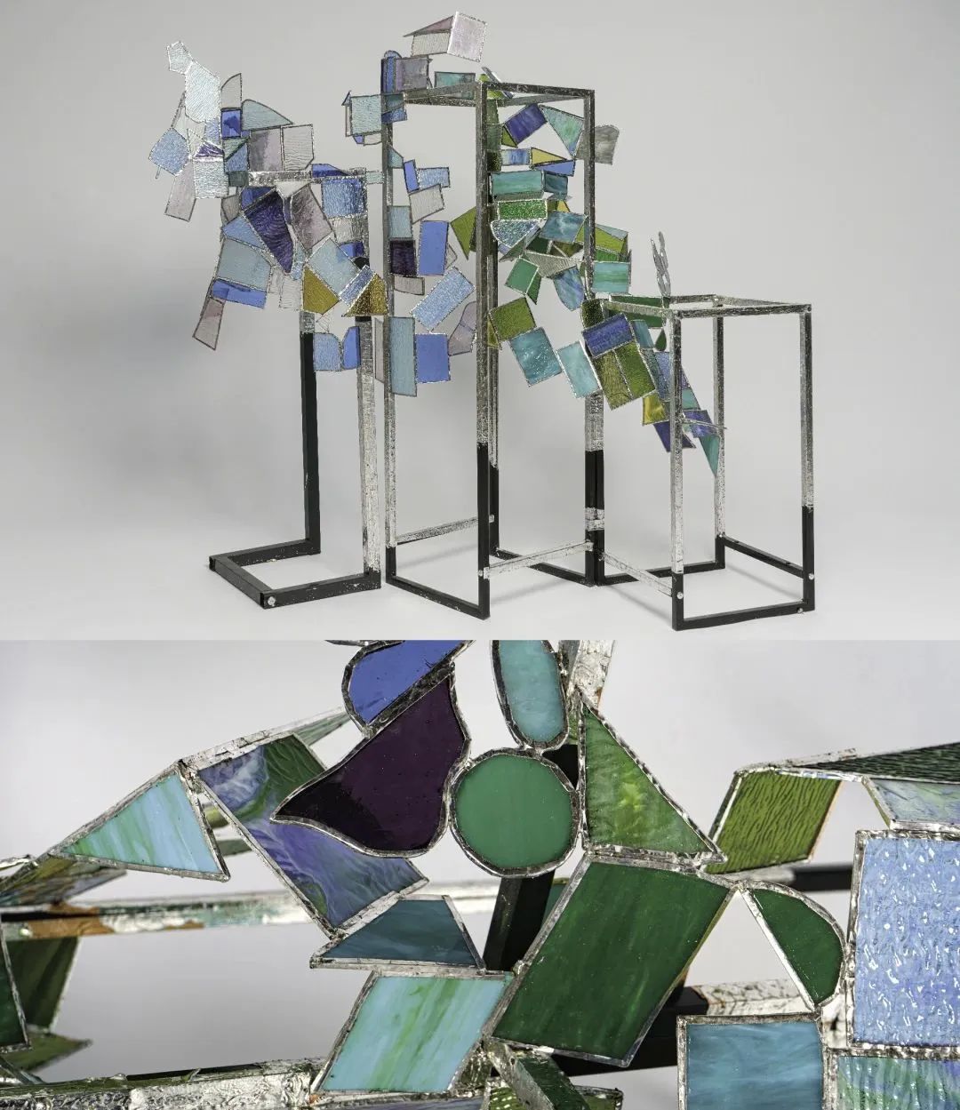 关于地图有人这么说:村落成了圆,符号成了诗,板块成了歌;历史长河中,地图的创造给人带来了无尽的知识财富,从动物皮质地到现在的互联网地图印证着时代在变但人类对地图需求却不曾减少。而现在岁月把思念的影子拖进了纤细曲折的色块,将传统地图形式打破,用块状彩色玻璃做成环绕立体式设计,作品板块的变化表达了作者对于家与学校两地之间的深爱之情。是美丽的羁绊,亦是远行的勇气。