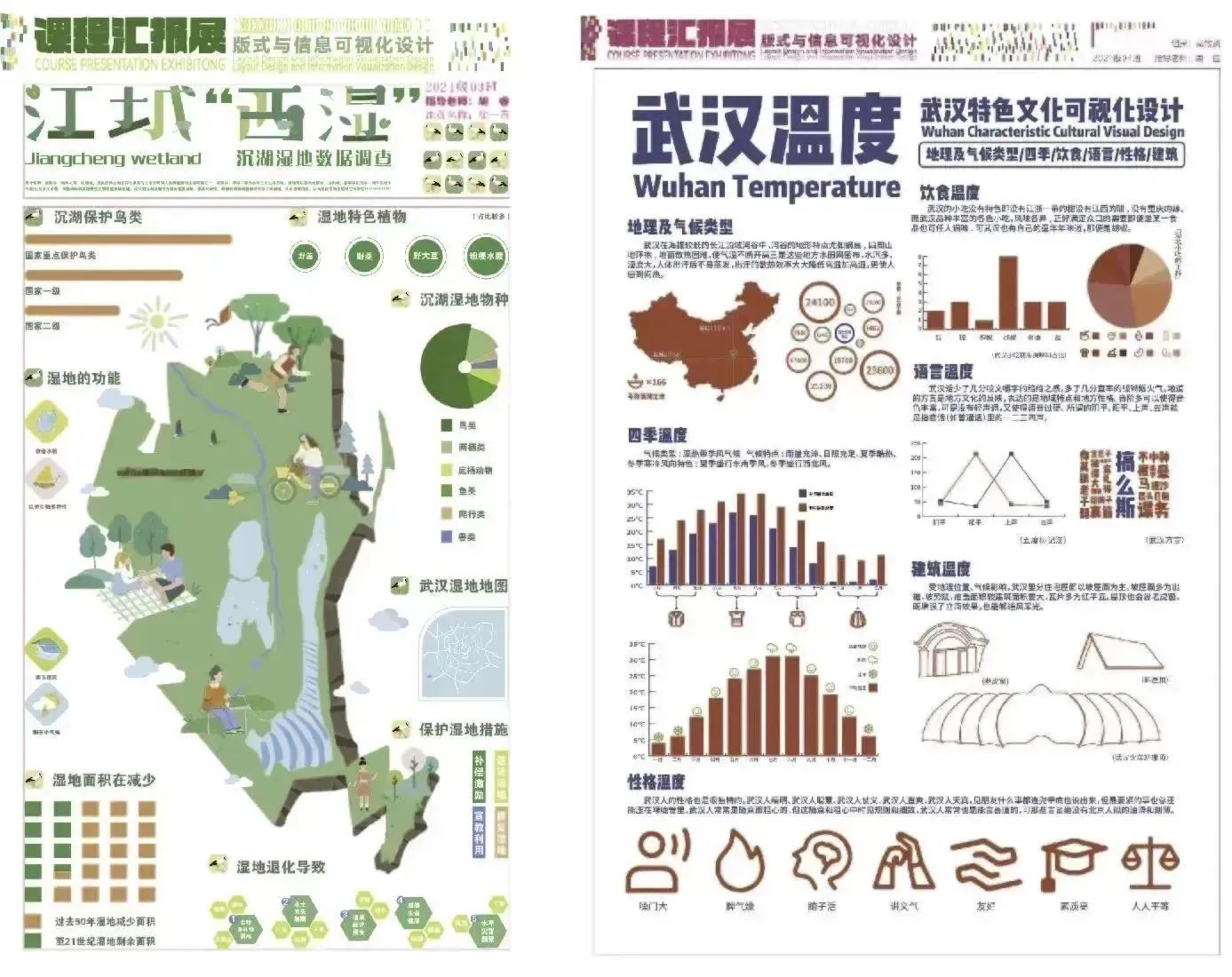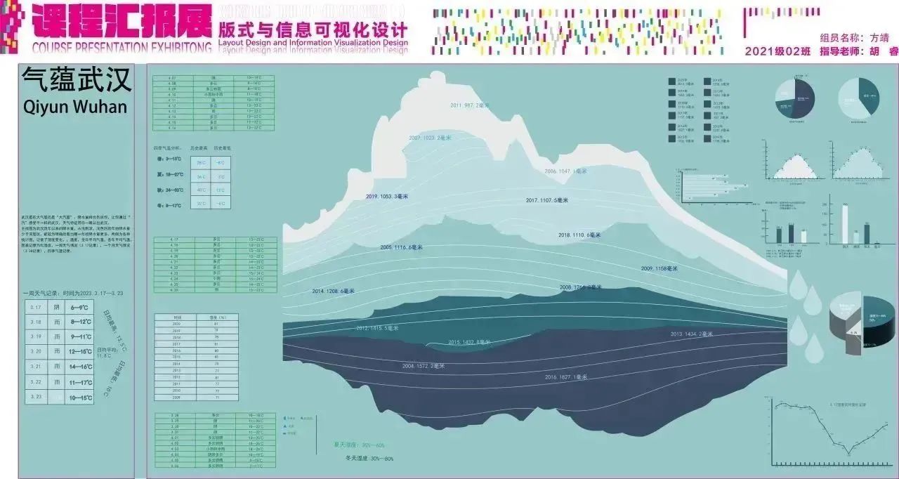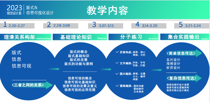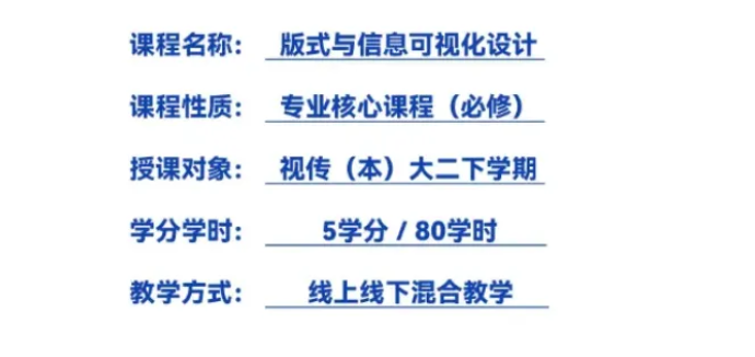 《版式与信息可视化设计》是面向大二学生的专业核心课程。它通过讲授、示范、案例分析、小组讨论、作业练习等多种教学形式,培养学生的版式设计和信息可视化设计的理论素养和实践能力。学习这门课程后,学生将能够掌握版式设计的原理和方法,信息可视化设计的概念和技巧,以及加强学生软件操作的技能。学生也将能够用信息可视化设计展示、提升版式设计的能力,以及对复杂信息的提炼、整合、归纳的能力。这门课程的目标是让学生用设计思维和技巧为信息传播、推广提供有效的解决方案,并为后续专业核心课程和创新创业项目提供技术和美学的支持。课程紧跟信息时代发展的新趋势和新技术,强调信息可视化设计不仅是一种信息再现的方法,更是信息传达的手段。这门课程的评估方式综合考察学生的平时表现、作业完成情况和期末项目展示,反映学生的学习效果和进步情况。