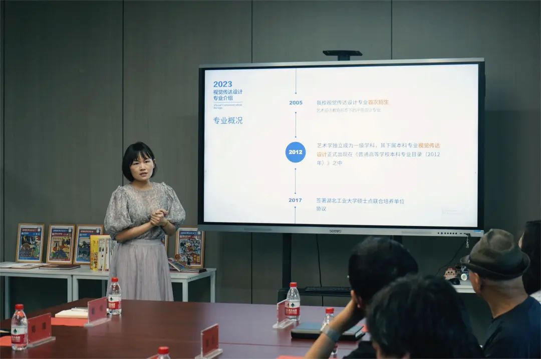 接着,戴嫚主任为大家详细介绍了视觉传达设计系的专业学科分类及发展历程,并重点介绍了2023届毕业设计中涉及艺科融合的作品,获得了在场嘉宾的掌声。