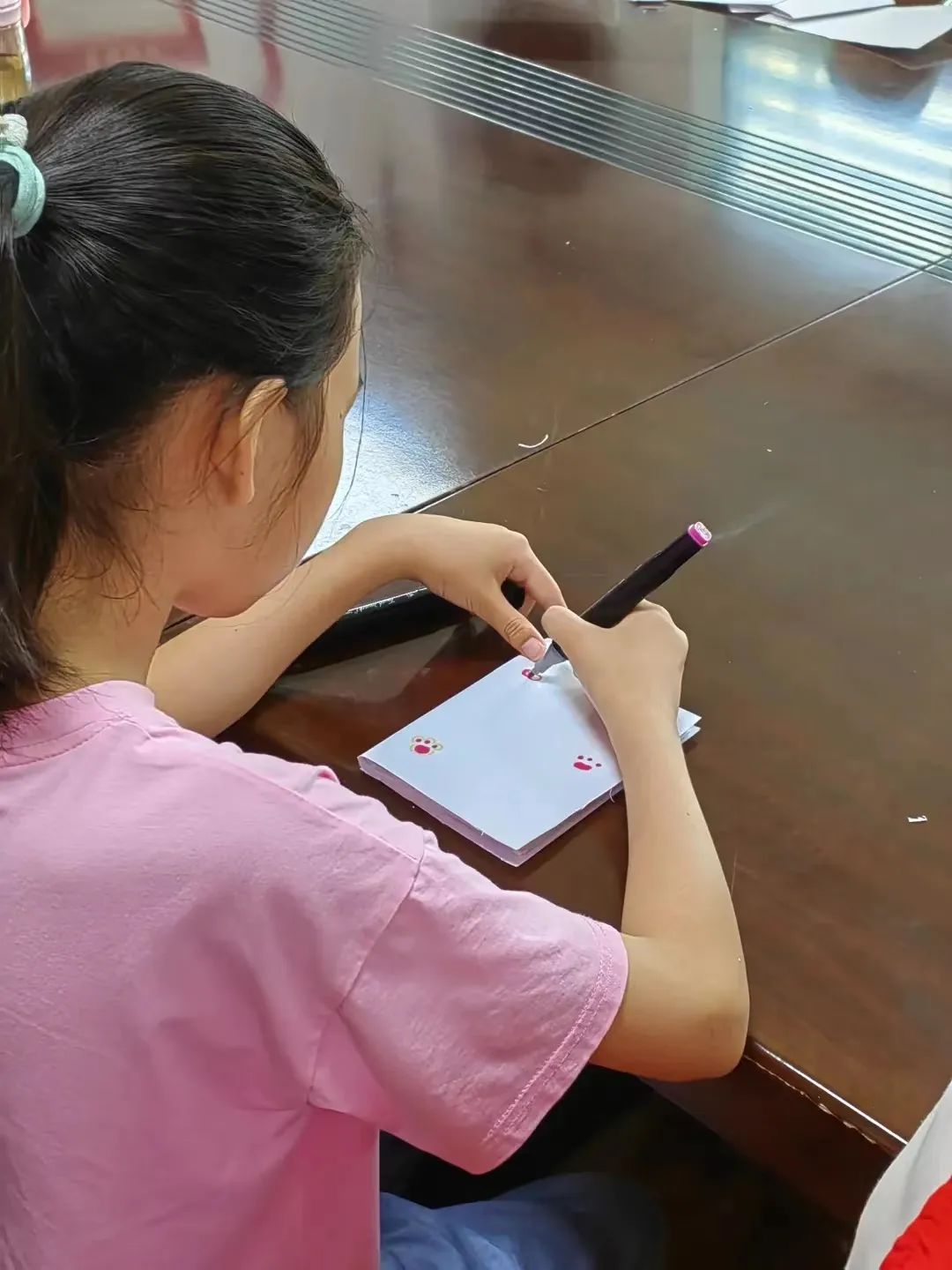 志愿者老师,耐心的为小朋友们讲解本子的结构与制作过程,并手把手的指导每一位小朋友完成她们自己的作品。从一开始的大小设计、纸张选择、初步裁切再到引针穿线、书脊上胶。小朋友们也从最开始的好奇与害羞变得开朗积极。