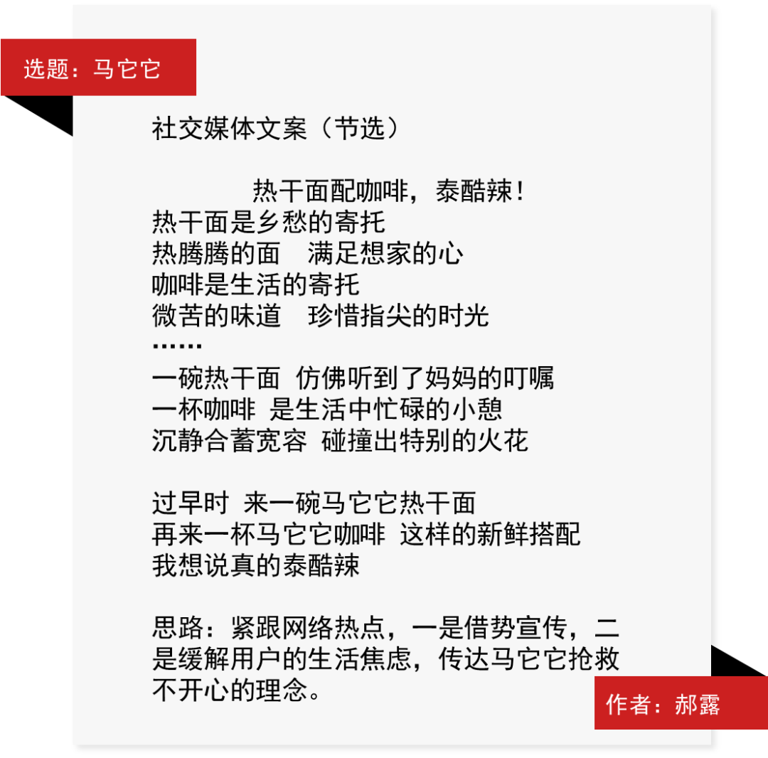 《广告文案写作》课程是广告学专业的专业核心类课程,是培养广告学专业核心能力的重要课程之一,具有较强的理论性、实践性和应用性。广告文案是表现广告创意的重要途径,也是广告作品的重要组成部分。本课程主要讲授广告文案的基本理论、典型范例等,使学生掌握广告文案的基本观念、领会广告文案写作的思考框架,掌握不同类型广告文案的写作要求与方法等。通过本课程学习,学生初步具备本专业领域内广告文案基本的赏析、判断能力,广告文案写作技巧,互联网广告文案的创作能力等,为将来从事文案写作或继续读研深造打下基础。