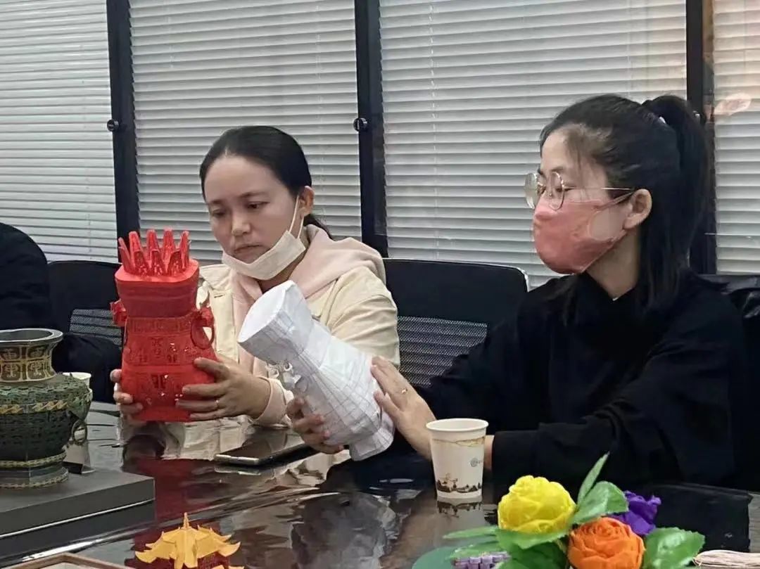 交流会中,我院师生团队与纸坊造团队进行了纸技艺与荆楚文化设计的多项探讨,双方就纸设计如何落地展开讨论。从纸技艺原材料的筛选与开模工具的选择,以及纸坊造团队对漆器、青铜器纸雕模具的进一步研发方式,提出了模具拆解与展现青铜器、漆器色彩展现的方式该做何解交流。纸坊造给出相应的器形纸制品,并分享了对已落地产品的总结和市场调研。