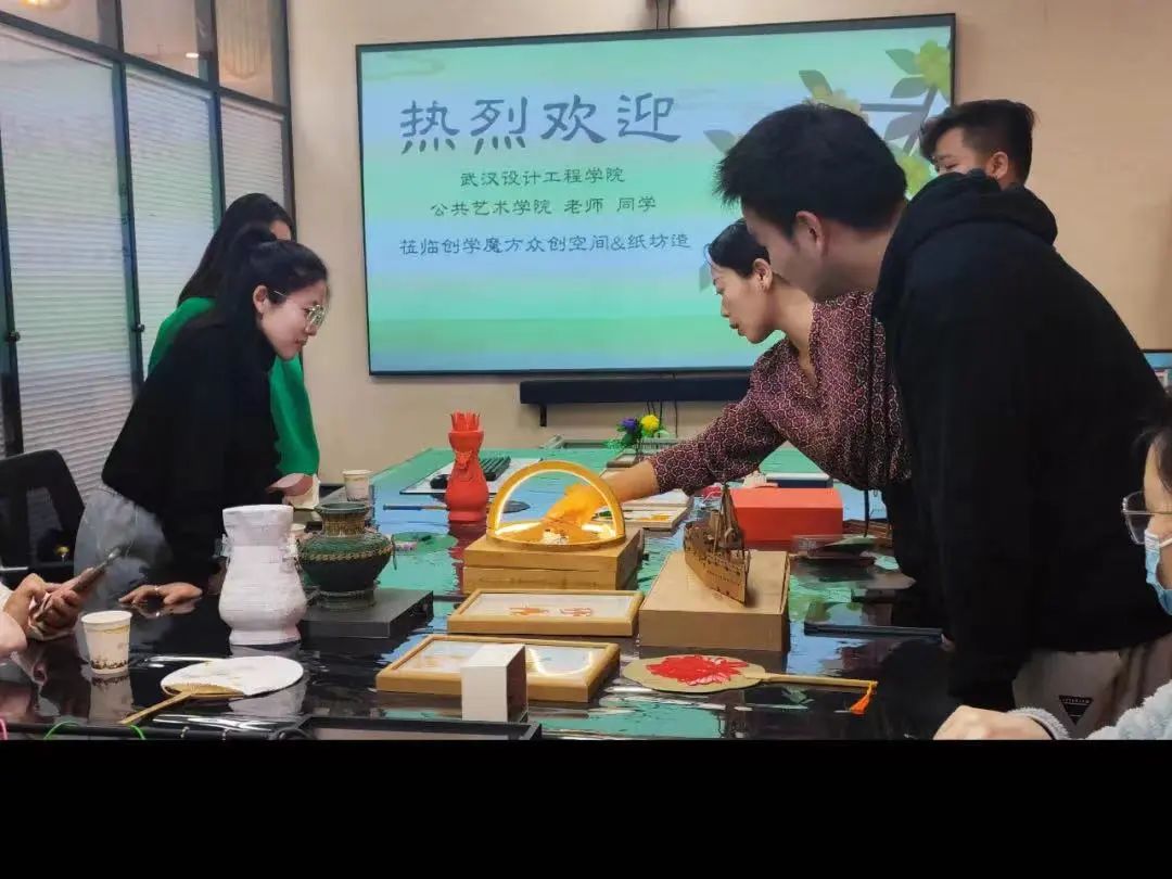 随后,我院师生们为纸坊造团队认真钻研传统手工纸技艺,结合荆楚文化元素进行的原创创作点赞。纸坊造目前以纸坊地方“传统纸技艺”作为立足点,进行文创元素的结合创作,在纸雕、衍纸、纸浆画三项,获得了良好的成果。