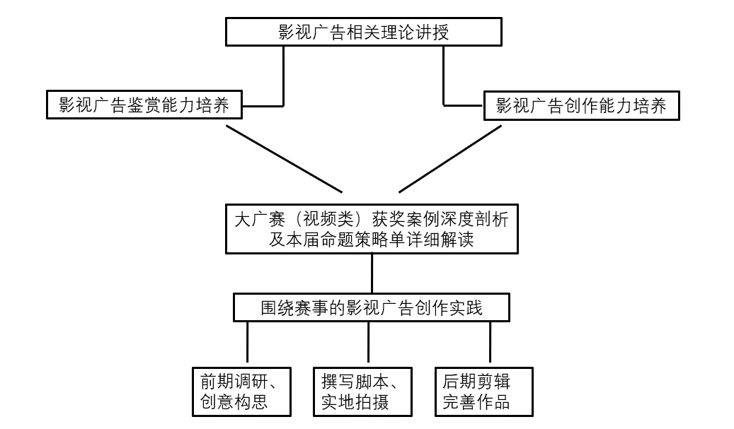 《影视广告创作》是广告学专业的必修课程,以培养学生将影视广告通过影视广告脚本、文案等方式表现出来的能力为主要任务,在本专业教学计划中占有重要的地位。该课程承接广告学的前期课程,如广告创意、广告文案写作、广告摄影、广告摄像、视频编辑等,是对这些基础课程的继续加深,是广告由理论到实践的一个过渡课程。通过本课程的学习,学生能够按照影视广告的作业流程完成影视广告创意、脚本写作、拍摄和后期制作,最终完成影视广告成品。在此过程中,提高学生的人文和艺术素养,促进人的全面发展。