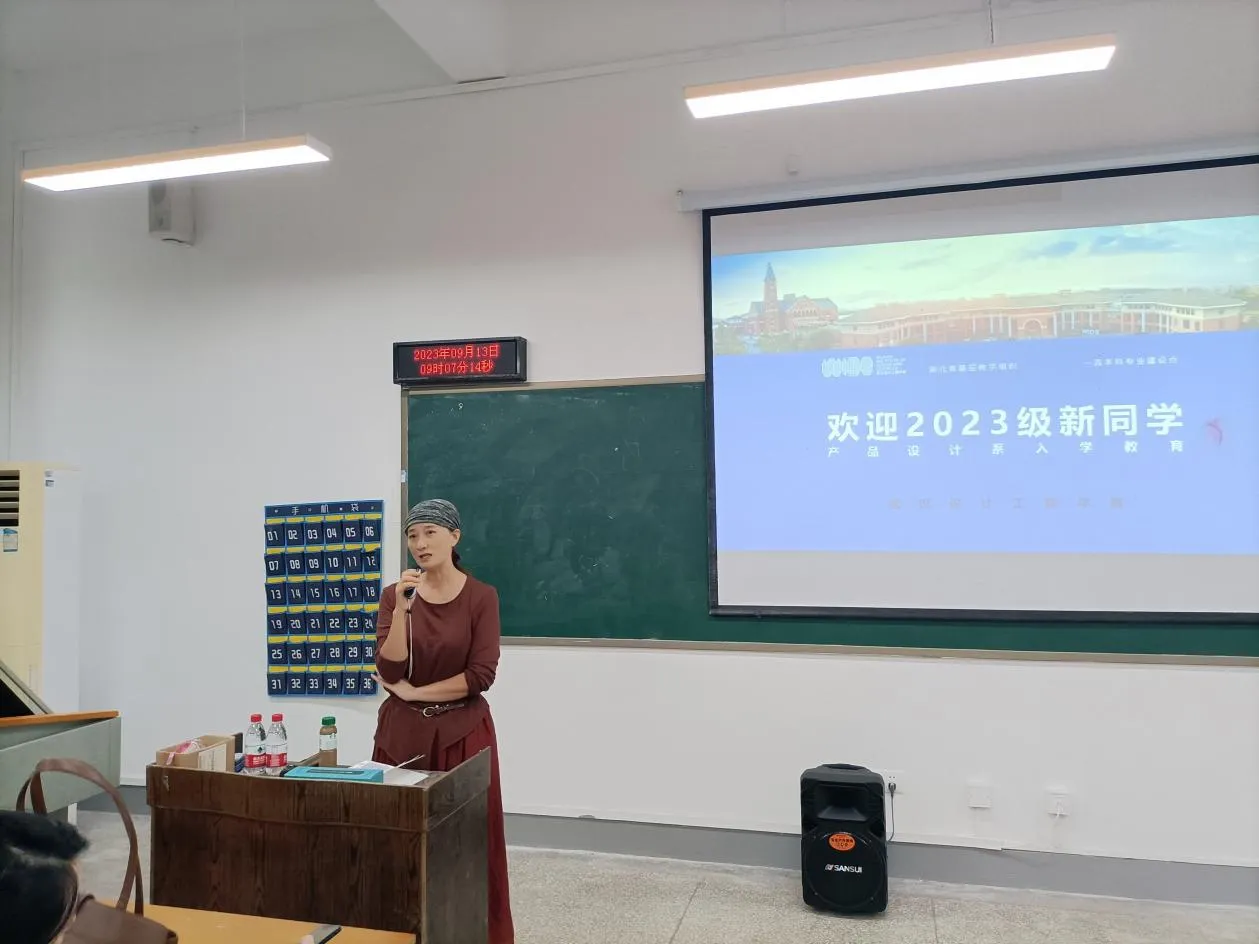 专业首席教授胡雨霞从“我们应该怎样学”这个问题展开本次入学教育的内容,为同学们细致地分析解读了本专业的课程目标和人才培养方案,从而帮助各位新生更好地树立学习目标。她指出,要“致广大而尽精微”,既要从广大处着眼,又从精微处入手去夯实产品设计专业基础知识,同时勉励各位新生重视自身发展,做好自我规划和时间管理,在大学刚开始的时候就要制定明确清晰的目标,多与老师沟通交流自己的想法,积极与高年级同学合作完成项目,这样在未来四年里才能有所成长、有所收获。