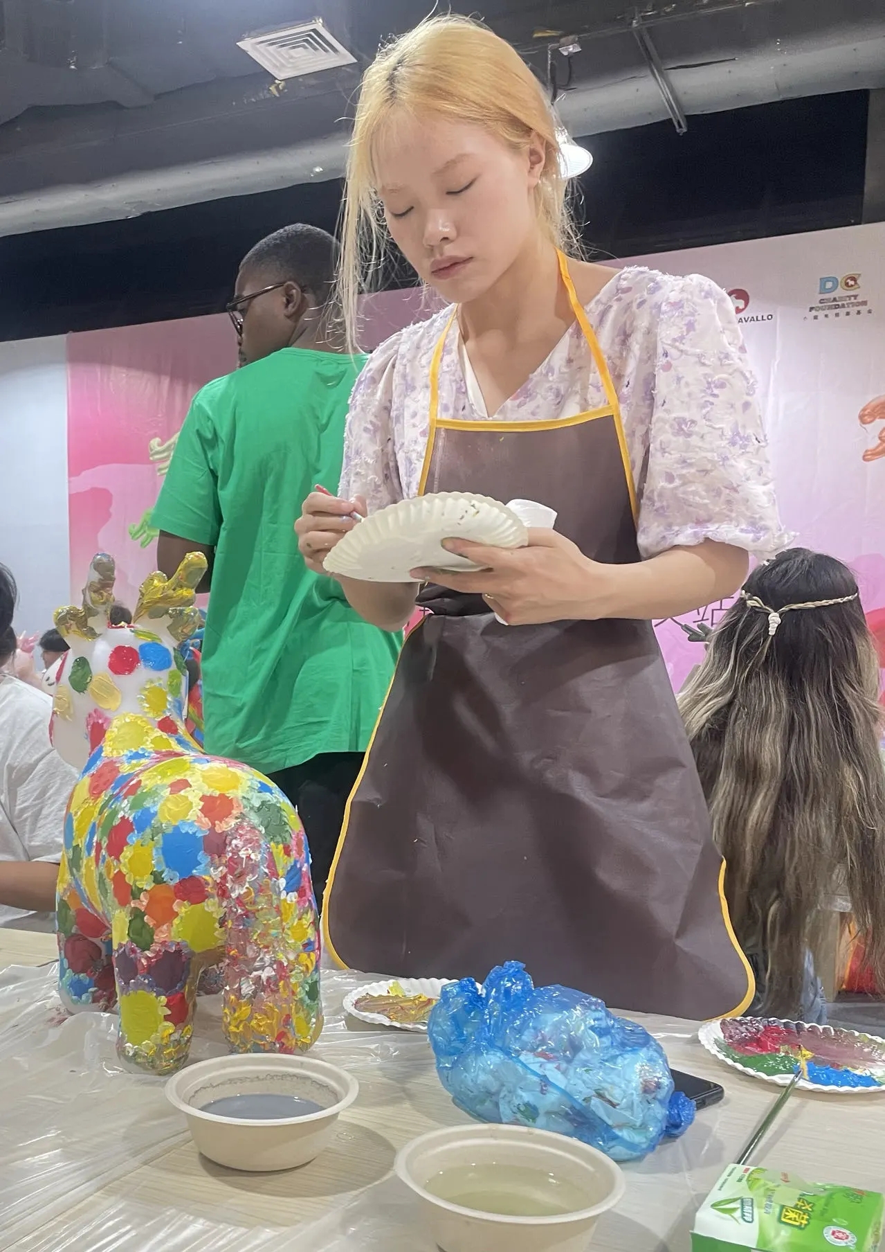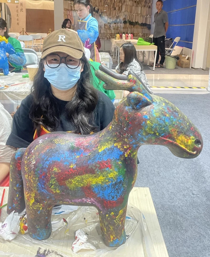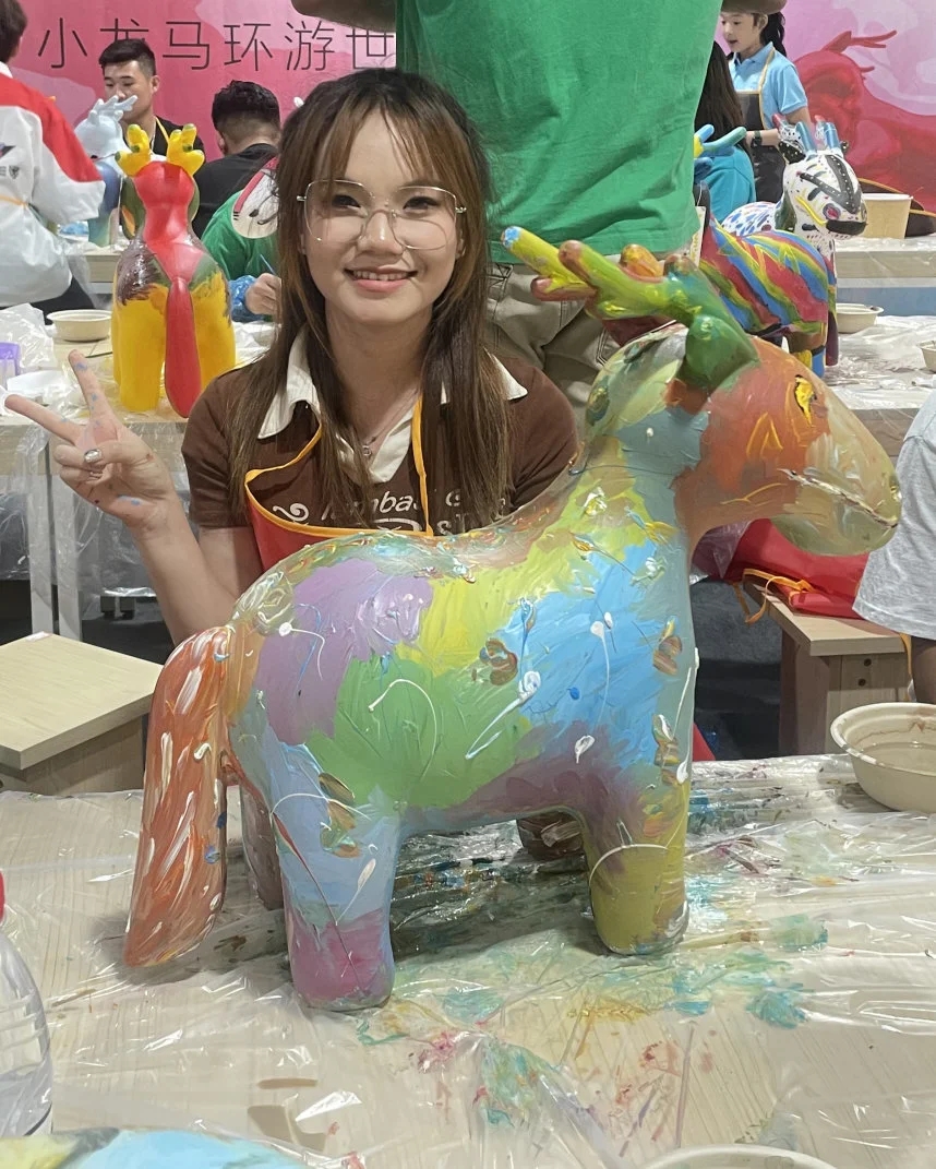 申娟(工艺美术2002):很荣幸能参加“小龙马”环游绘画活动。首先感谢学校、老师给我们这样一次机会,让我再一次感受到了绘画给我带来的力量。何谓龙马,就是头如龙,身如马。牠的创作灵感来自中国古代八大神兽之一的“龙马”,象征着希望与光明。龙马本身就有一种无形的力量。还有绘画现场氛围也是非常不错,能与外国友人一起绘画也是一次很不错的体验。能参加本次活动受益匪浅,感谢感谢!