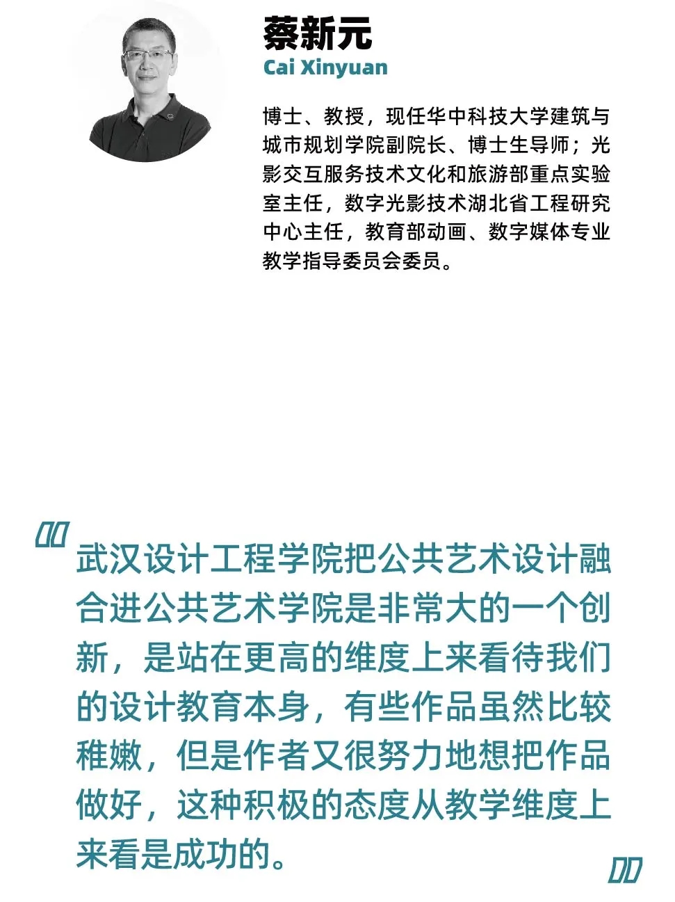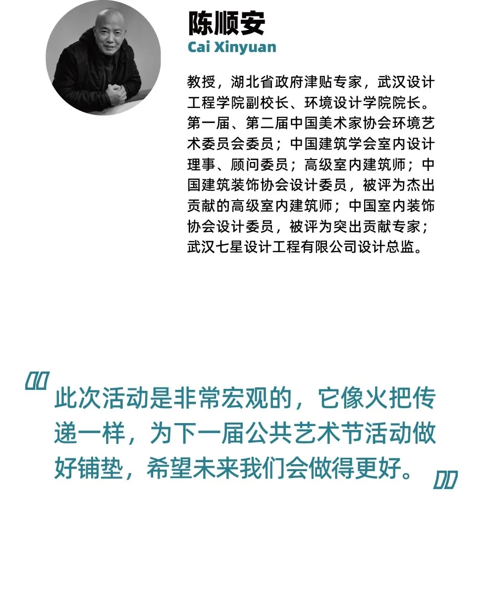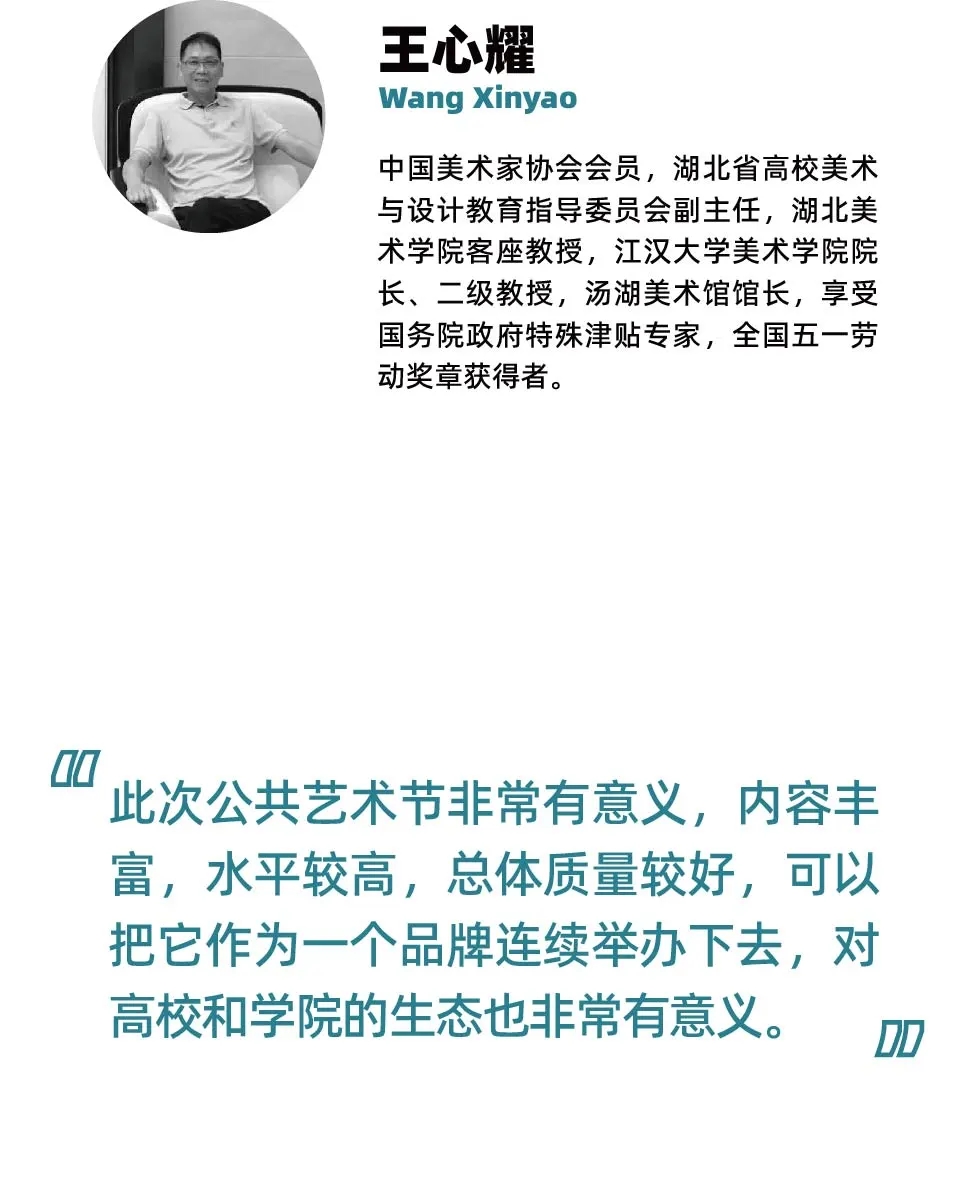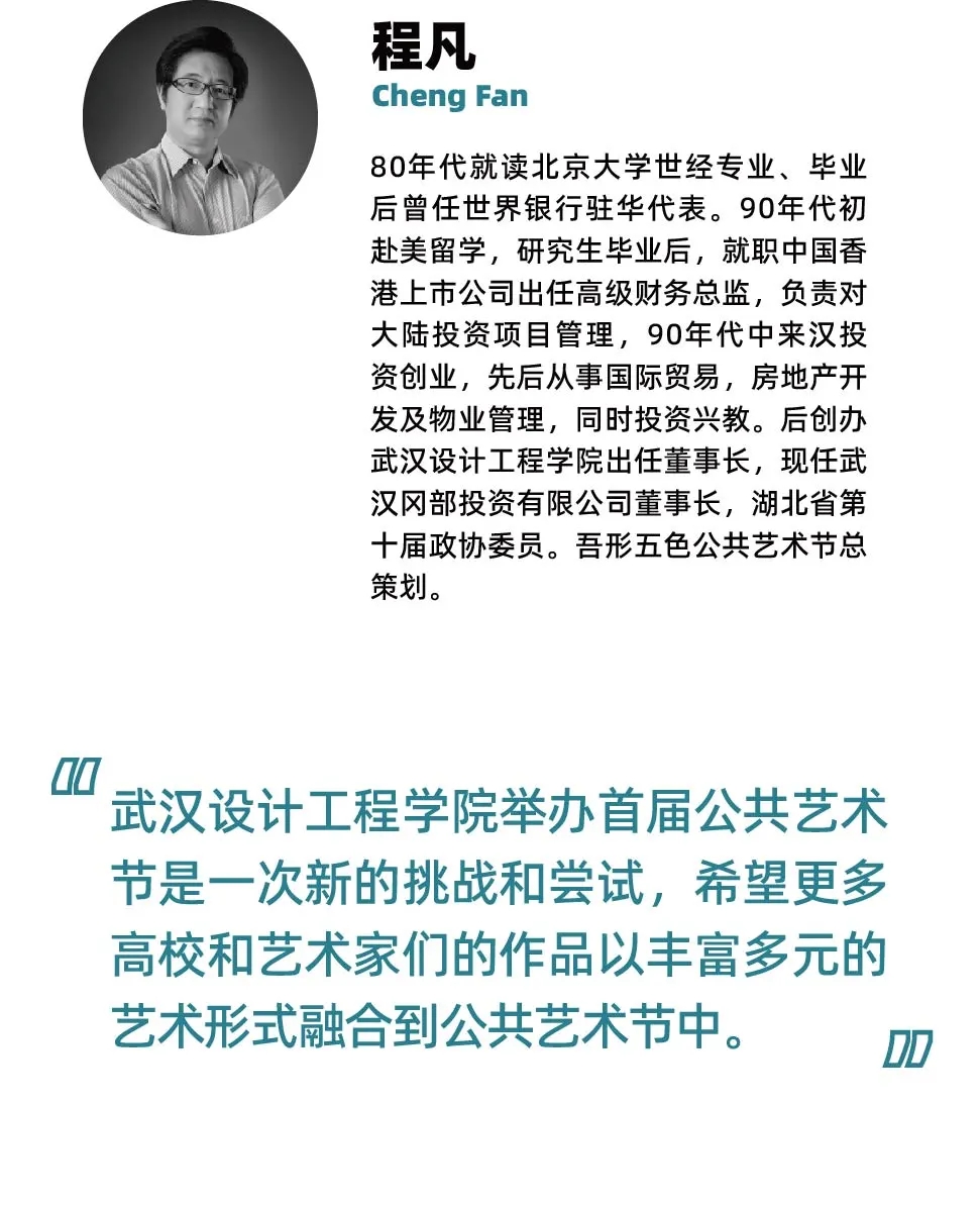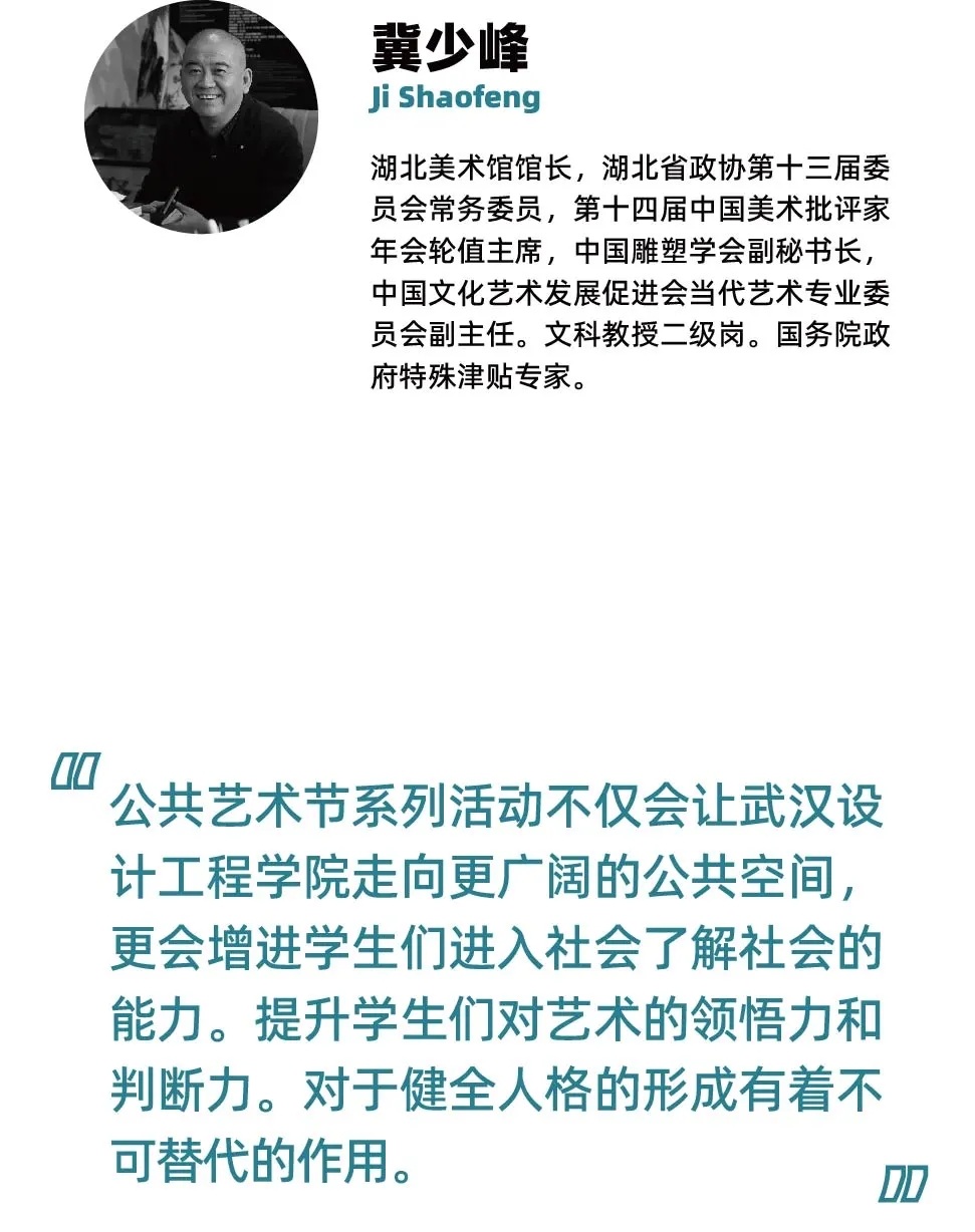 程凡董事长表示:“举办此次公共艺术节对我的初衷来讲,它是一个开端,不断地向外进行开放文化,同时向内也会发出一些多元的内容。希望此次公共艺术节能服务地方的文化和经济,服务武汉、立足湖北。同时,非常希望更多高校和艺术家们的作品以丰富多元的艺术形式融合到公共艺术节中,也希望能够得到社会各界包括行业专家们的支持”。