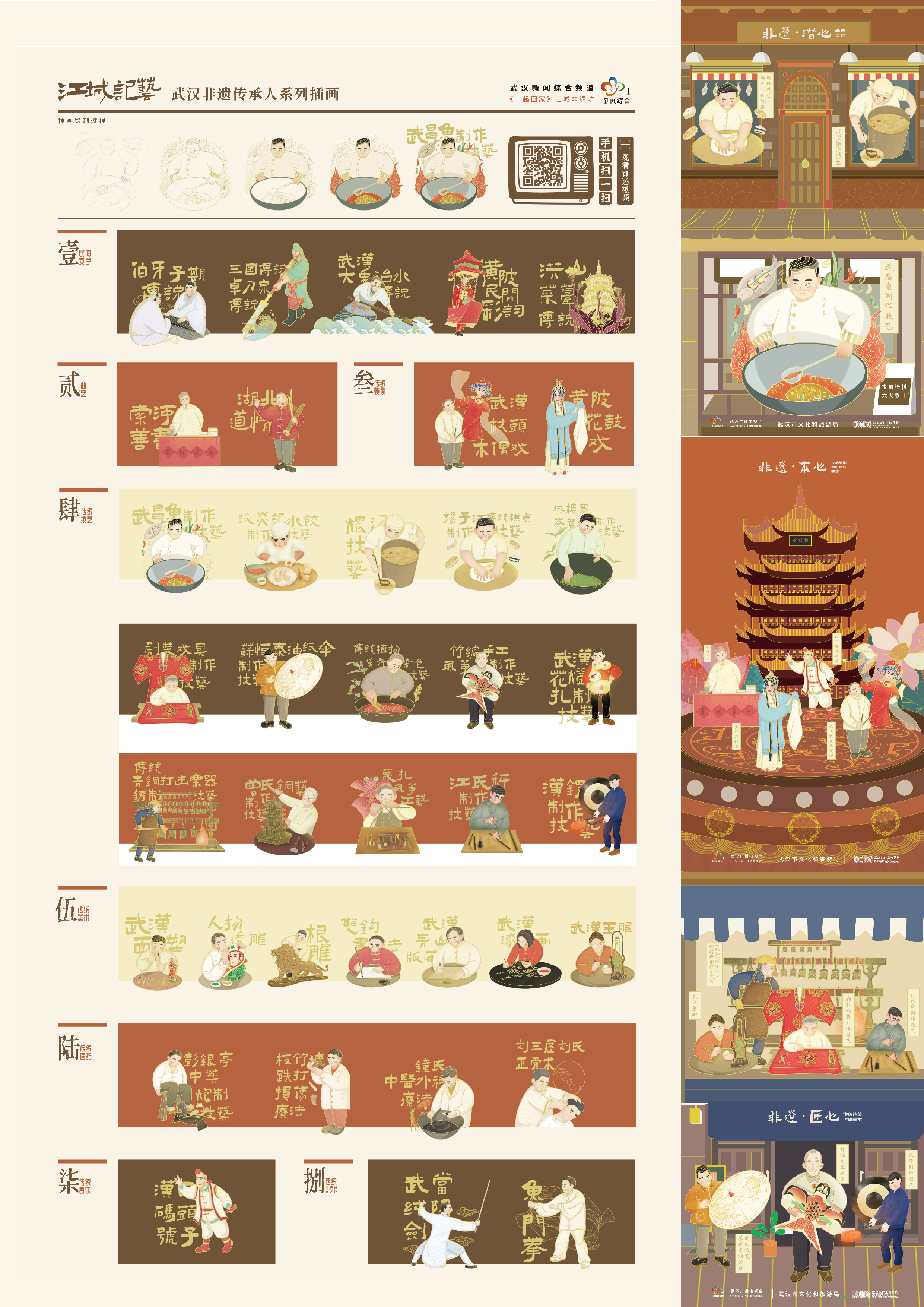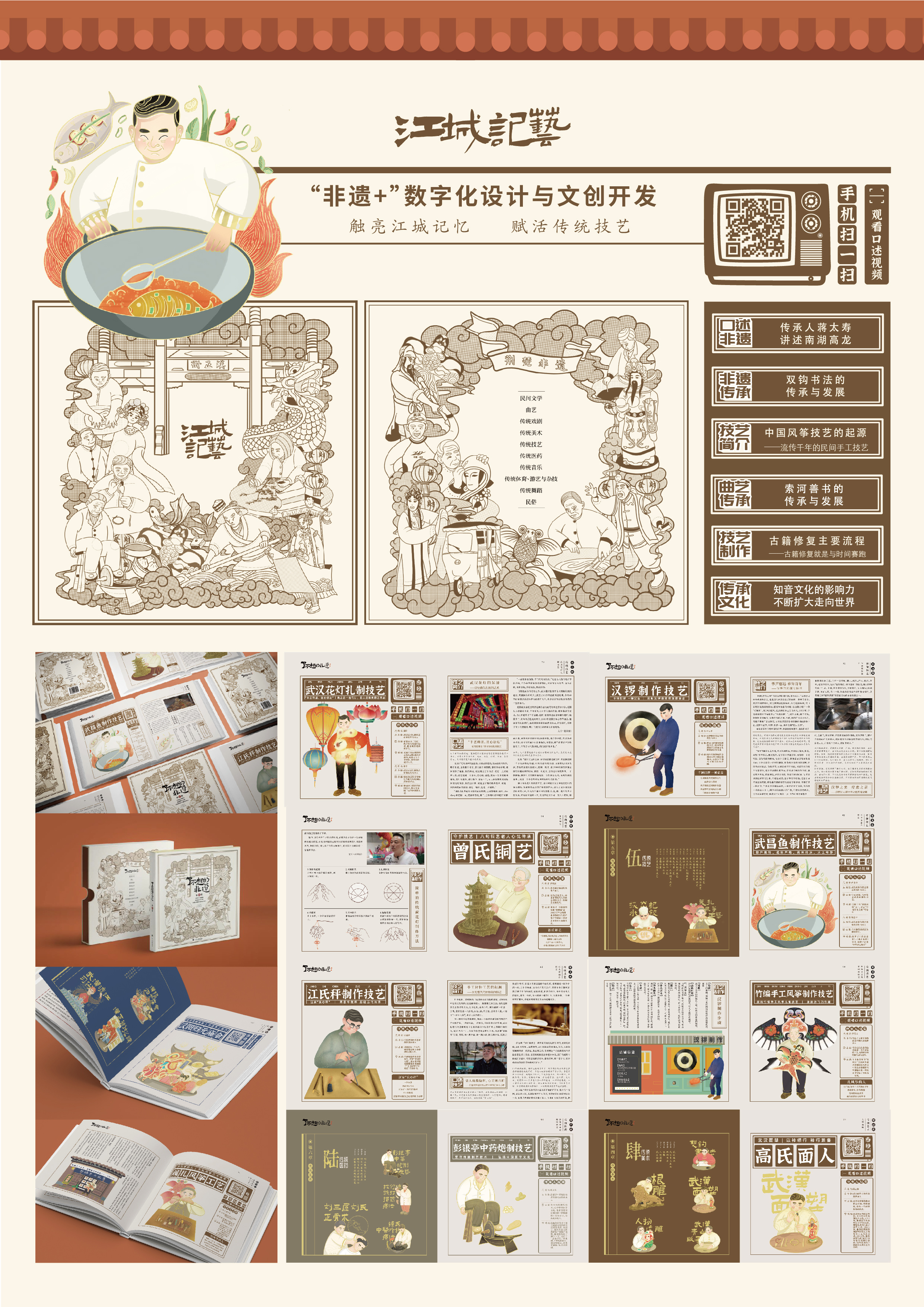 《江城记艺》项目联合武汉广播电视台《江城非遗坊》栏目,通过挖掘传承人和传艺店铺等非遗项目背后的故事,采用插画设计的二次包装形式,重焕江城的文化记忆,实现荆楚非遗的活化传承。该项目采用见人见物见生活的传承方式,以专业设计聚力技艺赋活,以互联融合助力江城新创,重焕江城的文化记忆,以项目品牌接力非遗添薪,助力非遗再生与传播。