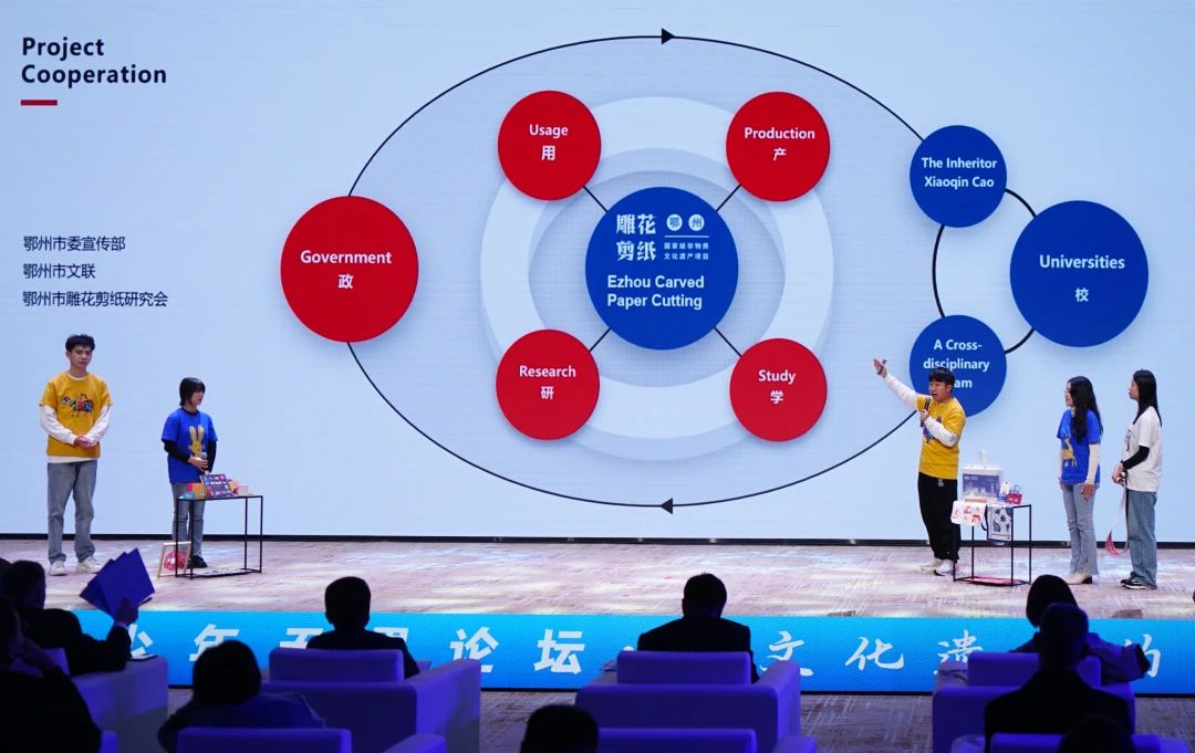 决赛当天,成员们以流畅自信的表达将“鄂州雕花剪纸”文创之路呈现在大家面前——由鄂州雕花剪纸项目省级传承人曹小琴主创的十米长卷《美丽鄂州·空港新城》、含有各类鄂州雕花剪纸元素的文创产品和鄂州吴都小学儿童剪纸,以互动展演的方式让观众和评委们留下了深刻印象。