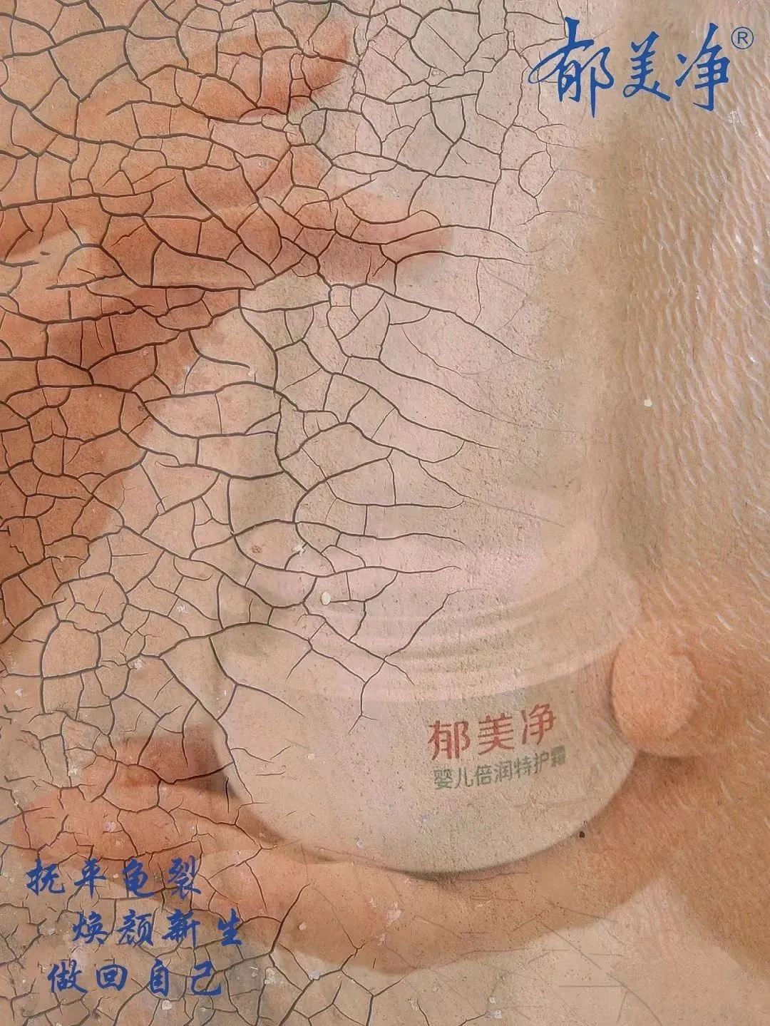 设计说明:运用夸张型的广告创意,夸大皮肤的干裂程度,用干旱的土地比作皮肤,干裂的地表用过郁美净产品后地表表现湿润比没有用的好,侧面衬托出郁美净的产品功效,郁美净在产品中添加鲜牛奶,而鲜牛奶有丰富的营养价值,含有大量的蛋白质、脂肪物,对调理皮肤,滋润皮肤有很大的功效,可以延缓皮肤衰老的作用,另一方面告诉我们郁美净品牌具有社会责任感保护环境,郁美净的产品成分天然健康无害。