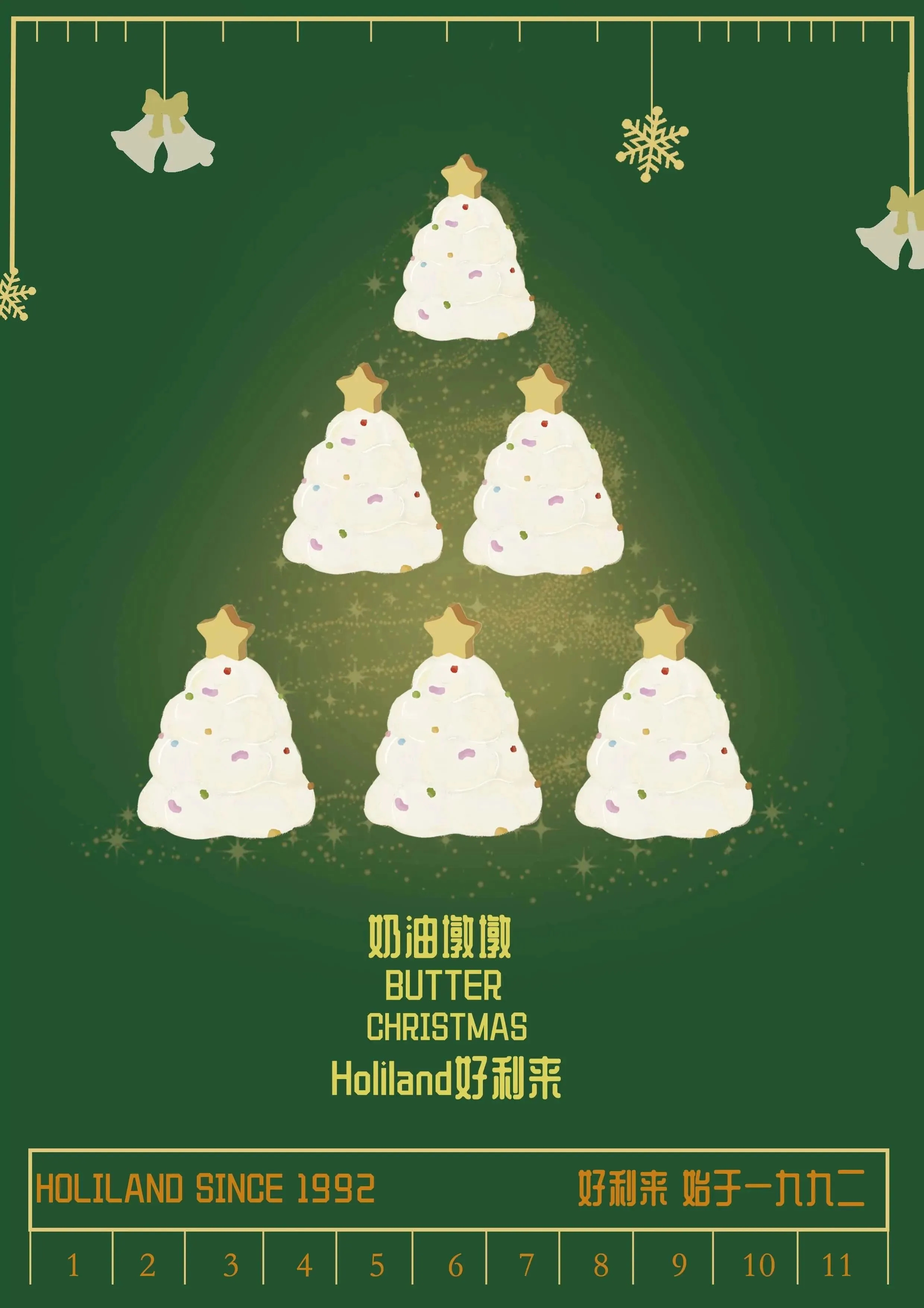 设计说明:运用联想的表现形式,在主体的造型上,把好利来“奶油墩墩”蛋糕堆叠成圣诞树的枝叶,把品牌名字、节日祝福以及蛋糕名称作为圣诞树的树干,由此构成一棵圣诞树。为了应圣诞节的主题,画面采集了黄、绿的颜色以及一些圣诞元素,以此更好表现出节日氛围。在整体布局上借鉴了本次好利来圣诞的包装设计,画面的顶部以及底部都选取了刻度,以此加深印象。广告语为诞愿甜到你,主要是想传达出在圣诞这浪漫冬日,这款蛋糕能为过节的你增添一些节日幸福感和圣诞甜意。