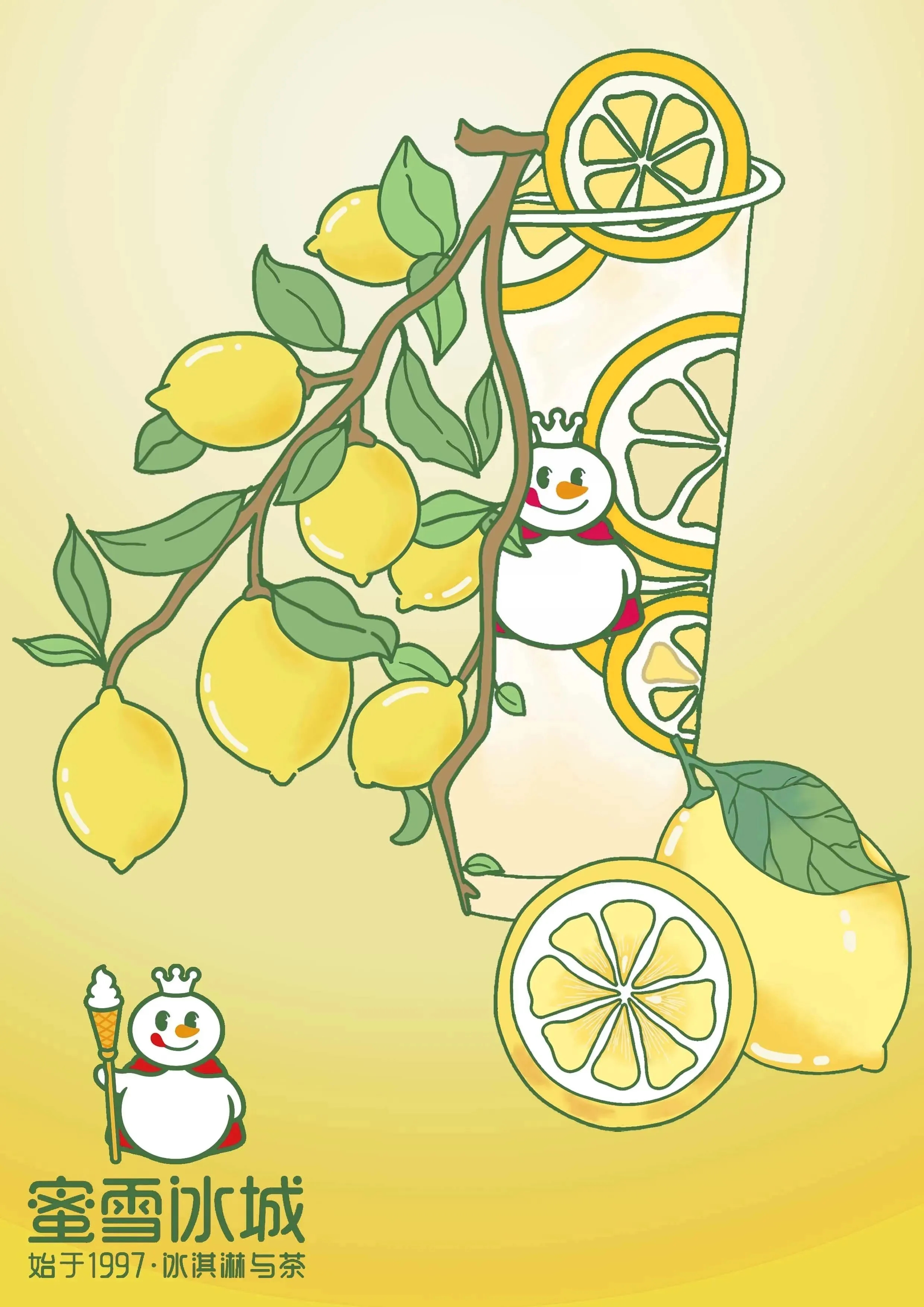 设计说明:通过联想的方法,将柠檬水里面的柠檬和柠檬树联系到一起,一杯蜜雪柠檬水长出了一枝丫的柠檬,由此来侧面体现蜜雪冰城的柠檬水中柠檬的新鲜。此次的海报设计我是通过手绘的方式来展现,将柠檬枝丫和蜜雪柠檬水结合起来,展现了柠檬水的新鲜性,而柠檬水和柠檬枝丫的分割则是用柠檬的枝丫来做双方的分割线,不规则感显得更加特别,同时柠檬水和柠檬枝丫的结合体现了柠檬来源的新鲜和健康。从整颗柠檬变成柠檬片再成为柠檬水,整个过程健康安全,而柠檬也是新鲜美味的。
