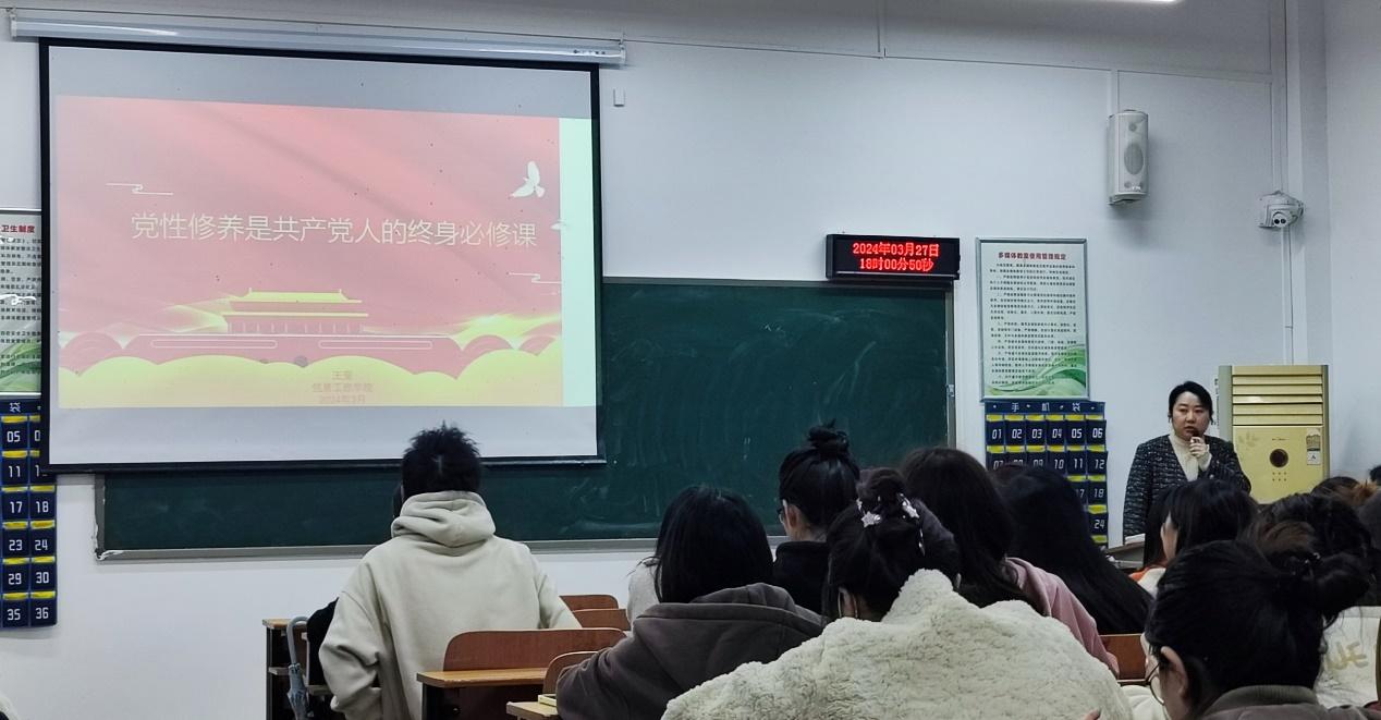 3月27日信息工程学院党总支部书记王莹讲道强化党性修养,是每个党员走好新时代长征路的前提,党性修养是共产党员的一门必修课。王书记重点讲解党性修养的核心要点,帮助党员同志们树立正确的世界观、人生观、价值观。课程结合时代背景和实际案例,分析面临的挑战,开展党性教育实践活动,指导党员同志们在实践中增强党性认识,坚定理想信念。