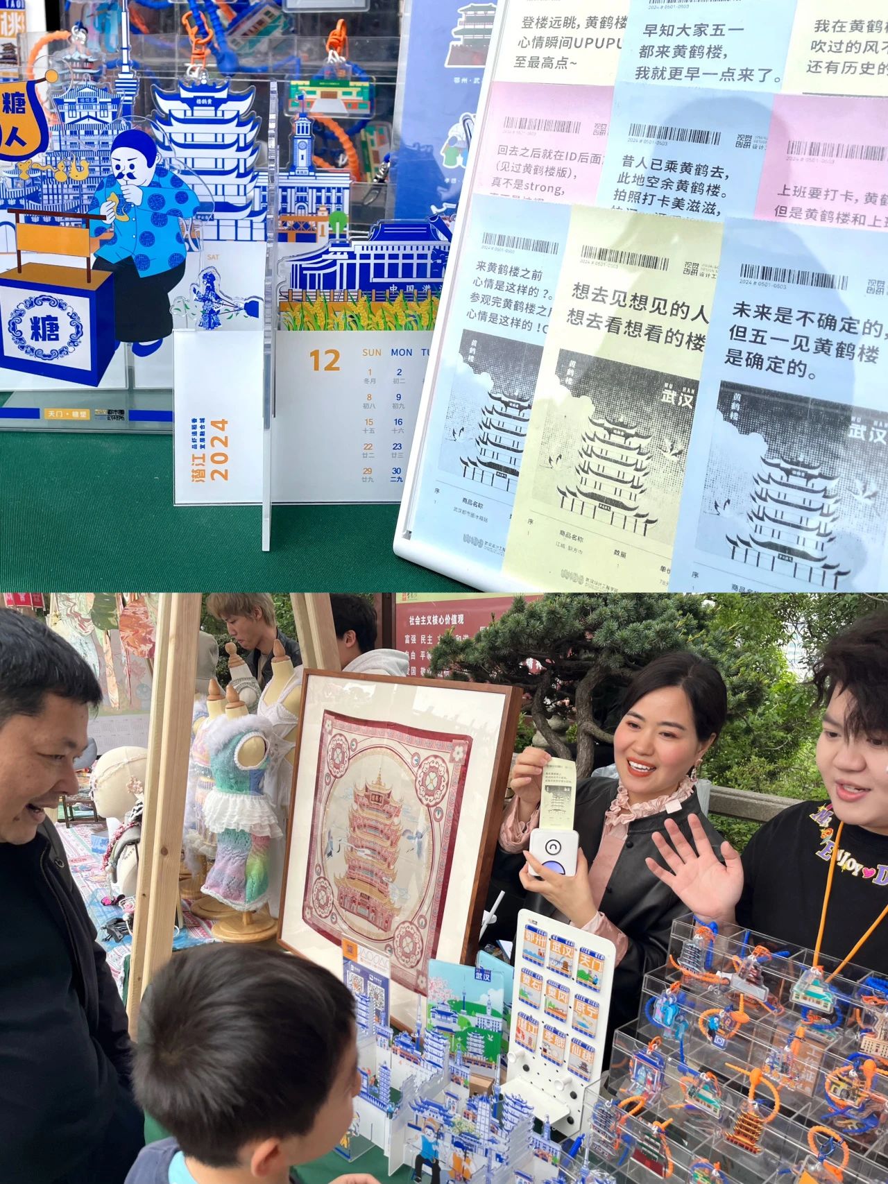 我校视觉传达设计专业“视觉创研设计工作室”这次带来了全新的文创体验,都市圈创研所系列之黄鹤楼钥匙扣、武汉城市冰箱贴,汉棉方巾系列之黄鹤雅韵、江桥叠韵等特色地标文创大受欢迎成为销售爆款。团队精心将市集所在地黄鹤楼的主体形象巧妙设计,并结合创意互动文案,为游客们量身定制了别具一格的黄鹤楼专属纪念小票。通过这种互动方式,让地标IP文创产品更具吸引力与记忆点,同时也拉近了游客与文创产品之间的距离,使产品更加生动有趣,成为游客们喜爱的纪念品和伴手礼。