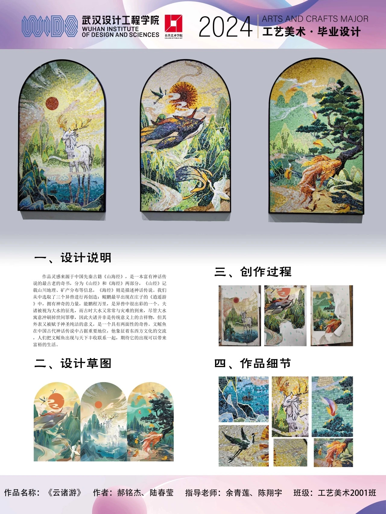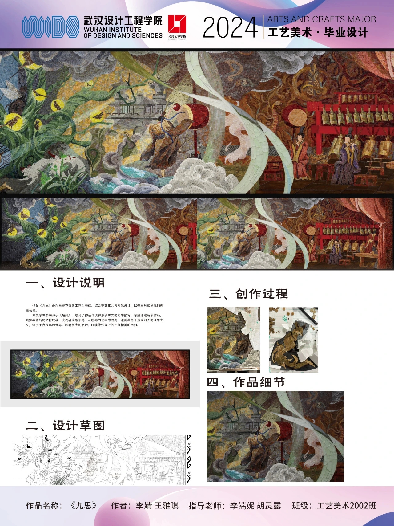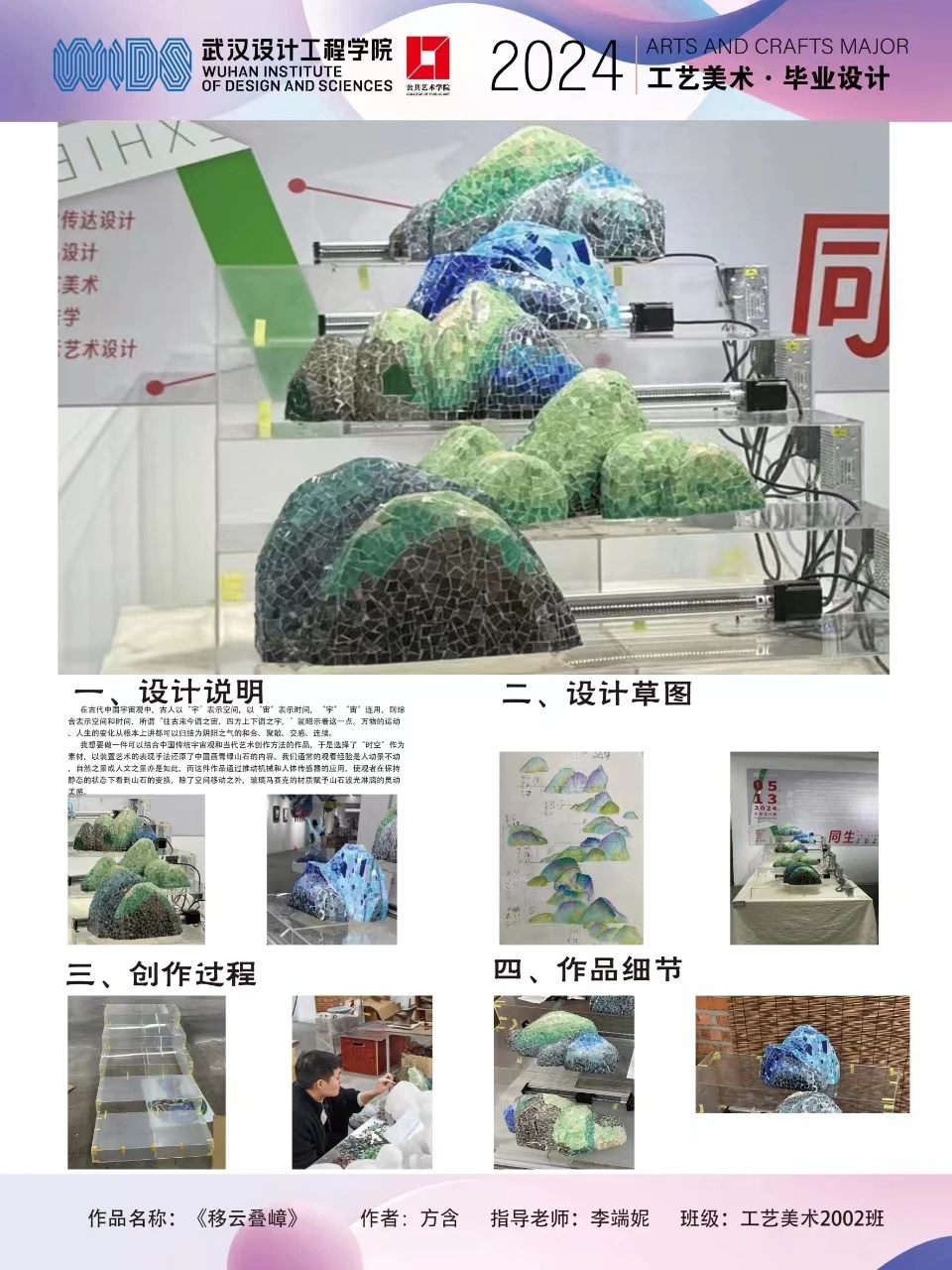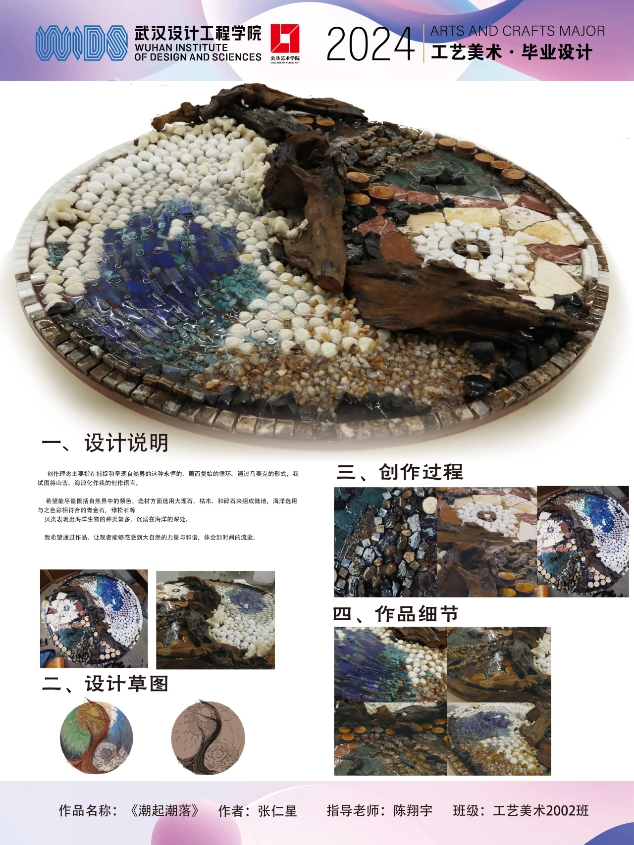 综合材料镶嵌艺术是一种融合不同材料和技艺的艺术表达形式,而工艺美术毕业设计则是学生在毕业前展示他们的创造力和技艺的重要机会。这些作品着重呈现学生在设计中的创新思维和实践能力,展现了大家对不同材料的运用以及对每种材质语言的不同程度的理解,如玻璃、陶瓷、木材、金属等,并且通过镶嵌、拼贴、雕刻等技法将它们有趣地融合在一起,用材料及其工艺的特性完成理念与情感的表达。我们在这些作品中可以看到学生们对于文明、环境、战争、内心情感等不同主题和意义的表达与探索,以及他们为了更加准确完善的将作品背后的创作理念和艺术价值表达出来,而在设计和制作过程面对的挑战和解决方案的积极状态与勤奋身影。