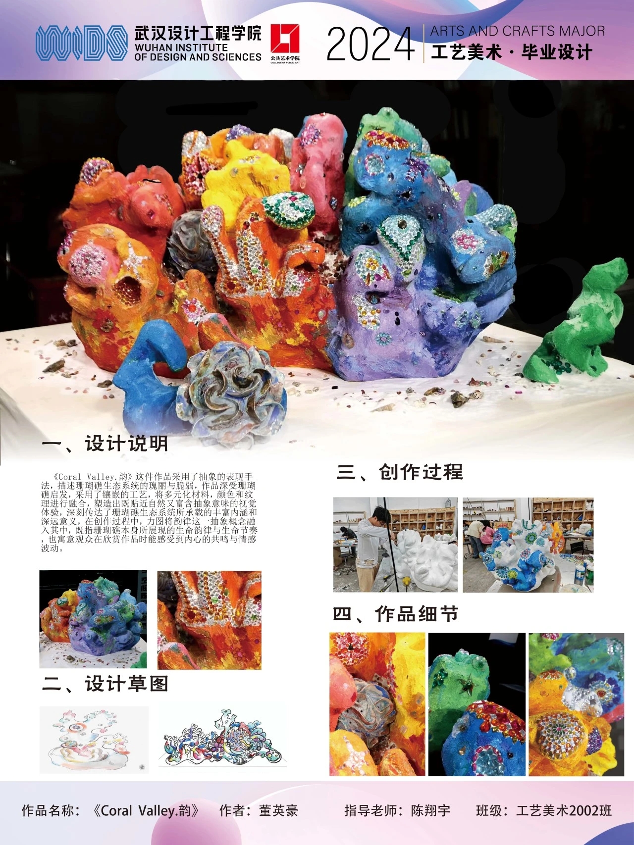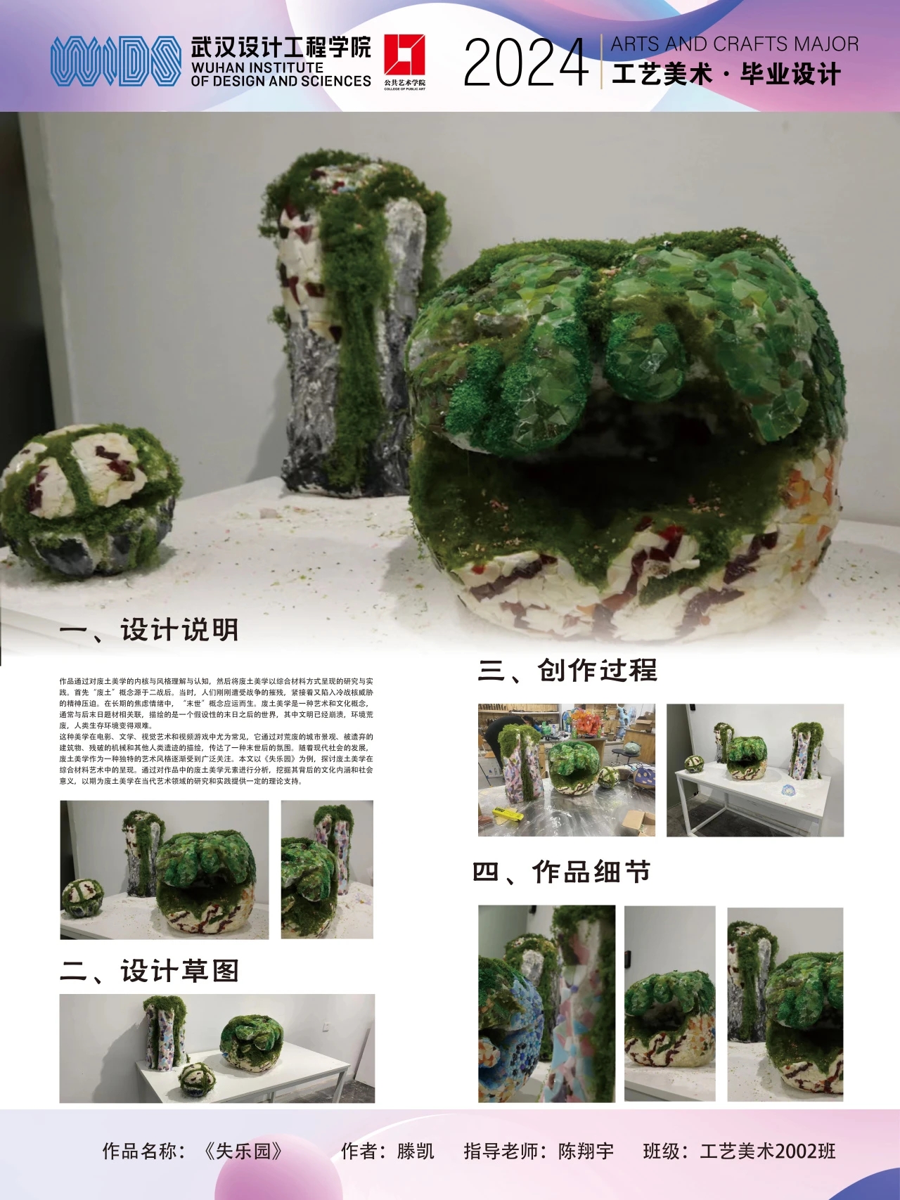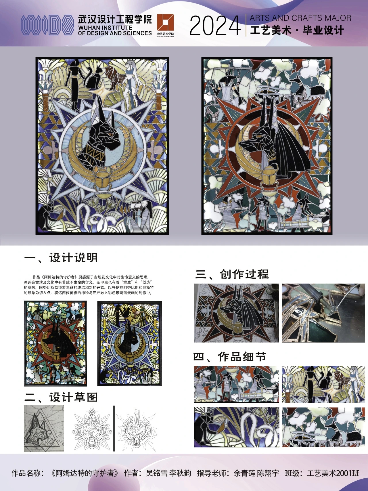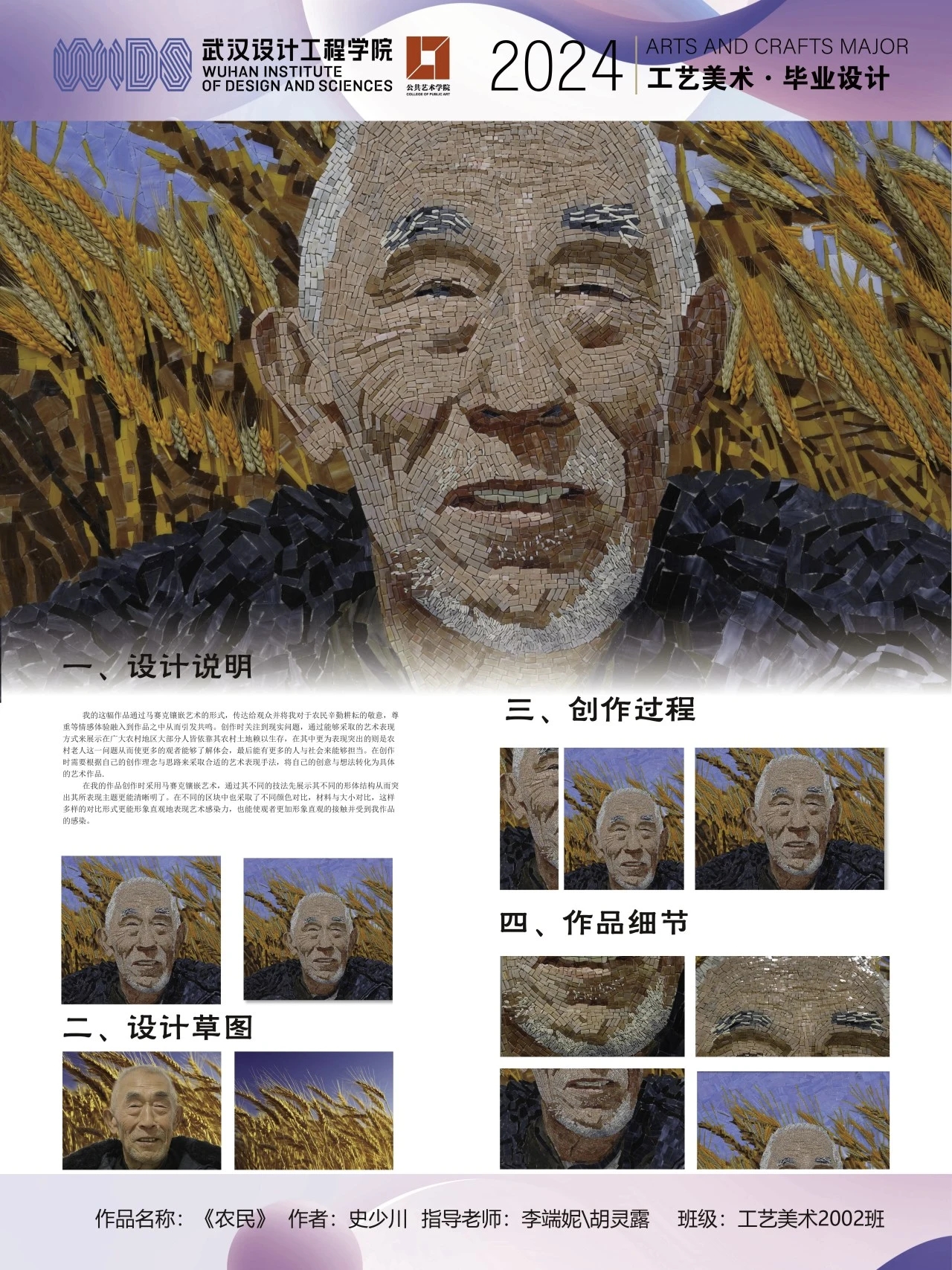 综合材料镶嵌艺术是一种融合不同材料和技艺的艺术表达形式,而工艺美术毕业设计则是学生在毕业前展示他们的创造力和技艺的重要机会。这些作品着重呈现学生在设计中的创新思维和实践能力,展现了大家对不同材料的运用以及对每种材质语言的不同程度的理解,如玻璃、陶瓷、木材、金属等,并且通过镶嵌、拼贴、雕刻等技法将它们有趣地融合在一起,用材料及其工艺的特性完成理念与情感的表达。我们在这些作品中可以看到学生们对于文明、环境、战争、内心情感等不同主题和意义的表达与探索,以及他们为了更加准确完善的将作品背后的创作理念和艺术价值表达出来,而在设计和制作过程面对的挑战和解决方案的积极状态与勤奋身影。