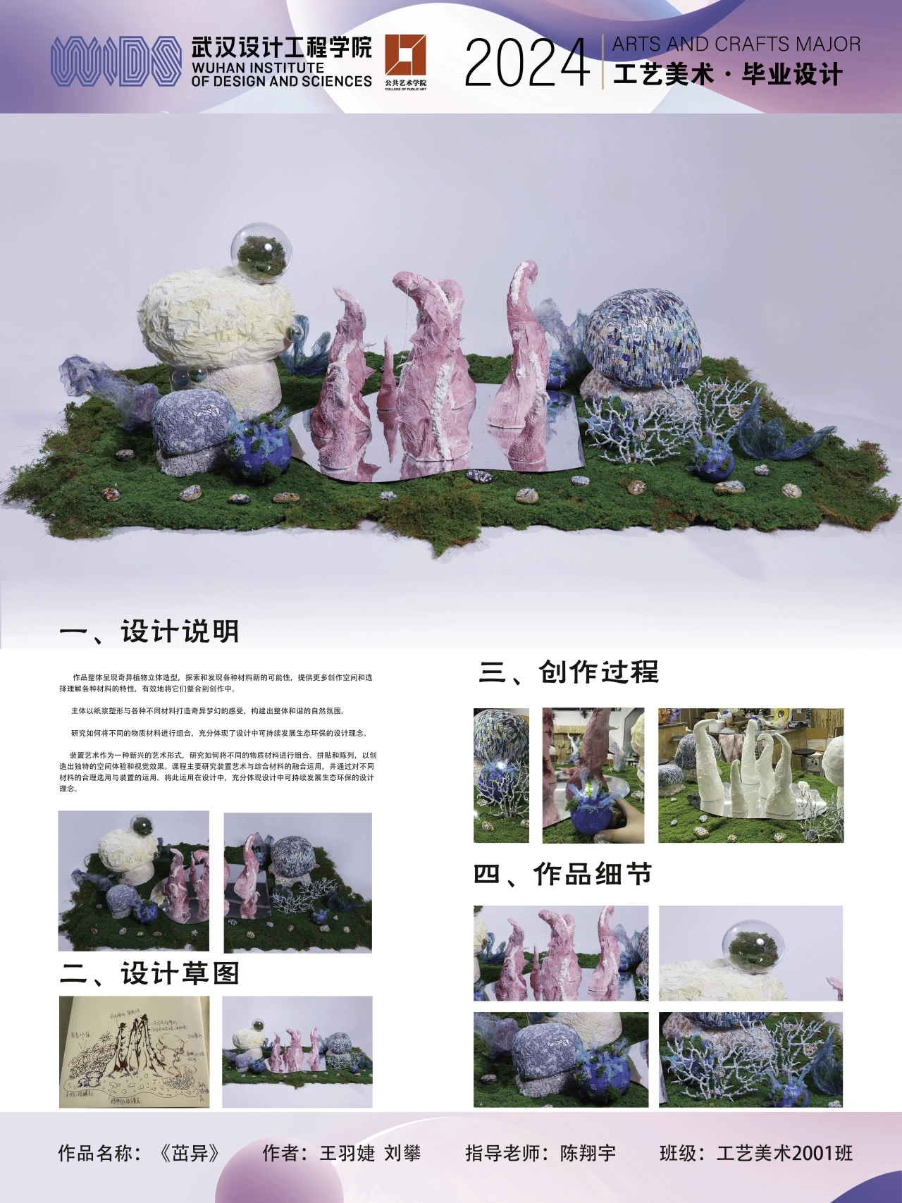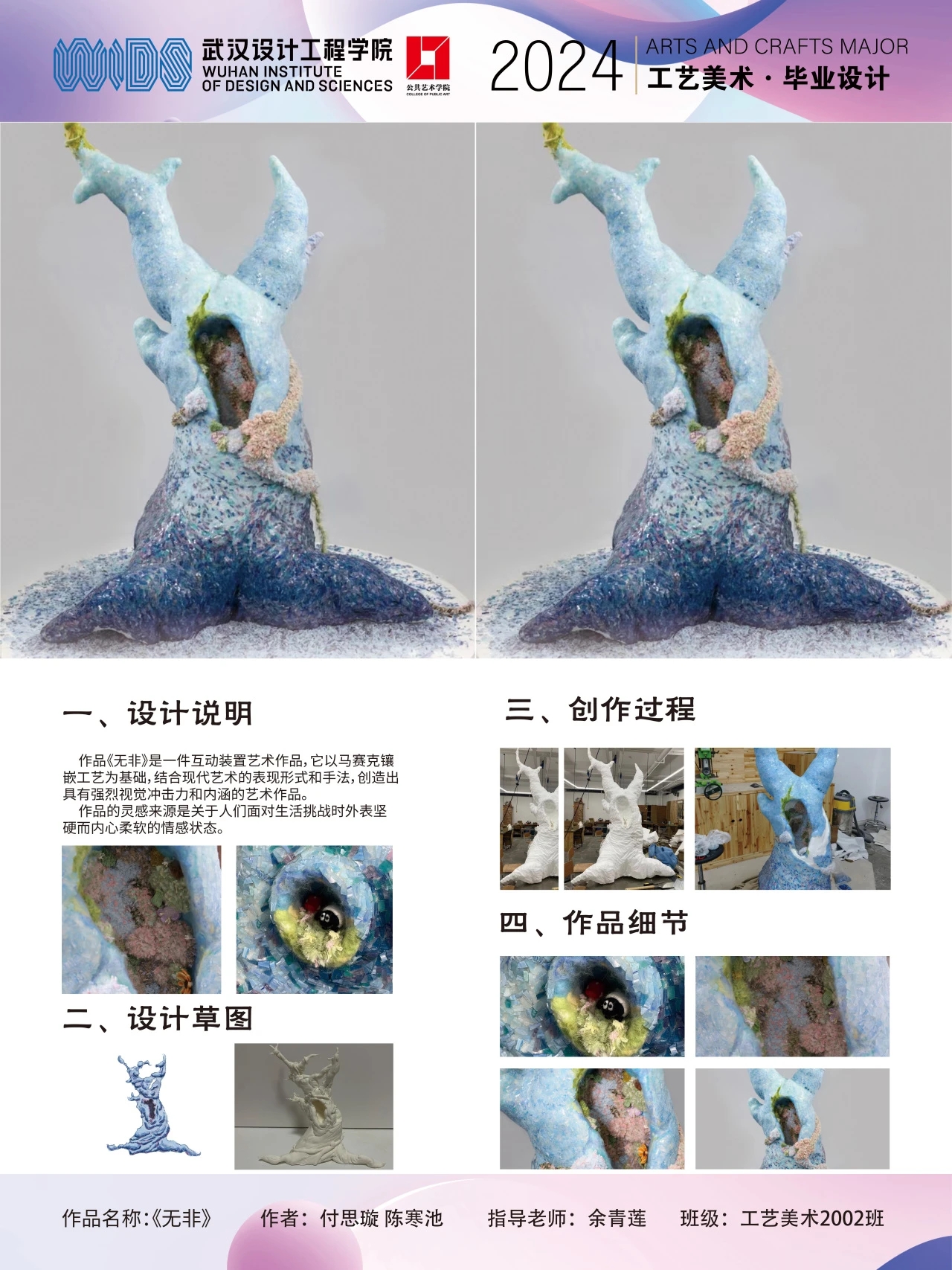 在这场工艺美术专业毕业展上,每一件作品都承载着学生们对艺术的热爱和对技艺的探索。他们通过细腻的手工技艺和深刻的艺术表达,展示了他们独特的视角和创造力。这些作品不仅是工与艺的结合,更是对社会与文化的思考和反思。从陶艺到纤维,从综合材料镶嵌到漆艺,每一件展品背后都蕴含着学生们对工艺美术不懈追求的汗水与梦想。见证了这些同学们四年的成长与进步,以及他们对未来的憧憬和探索。在这个充满灵感与创造力的展览中,工艺美术将以全新的方式展现出其独特的魅力和无限的可能性。