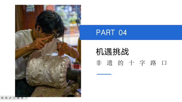 授课过程中同时完成了一场关于“中国银器第一村——鹤庆”传统非遗技艺发展的讲座,讲座现场内容包含四个部分,分别是家乡鹤庆、非遗传承、面对国家政府给予发展政策的扶持和鼓励,以及越来越多的年轻人开始关注并投身其中带来的机遇和挑战。