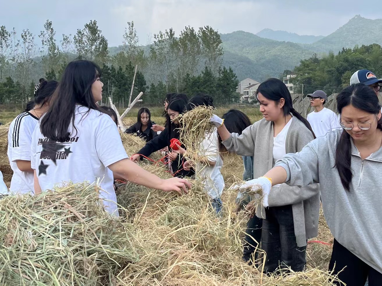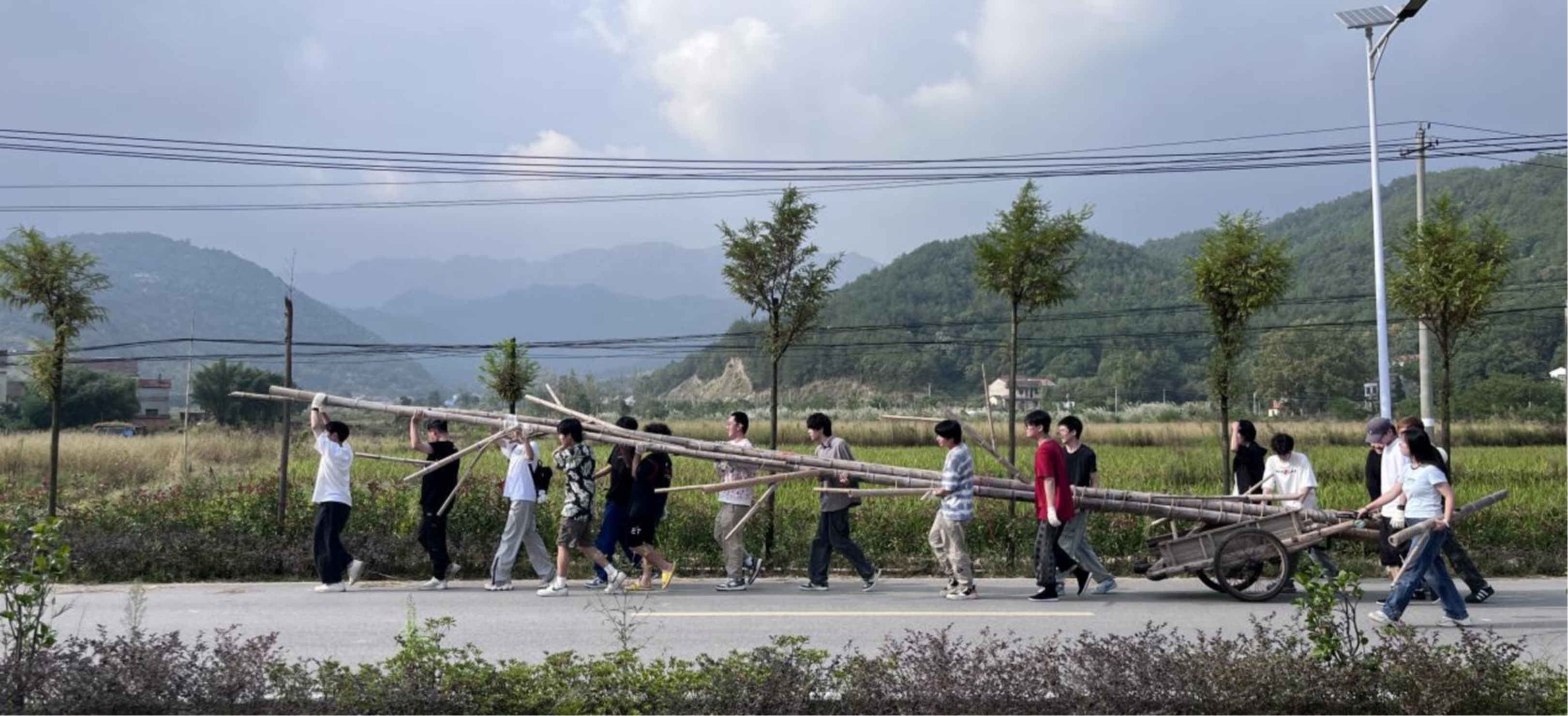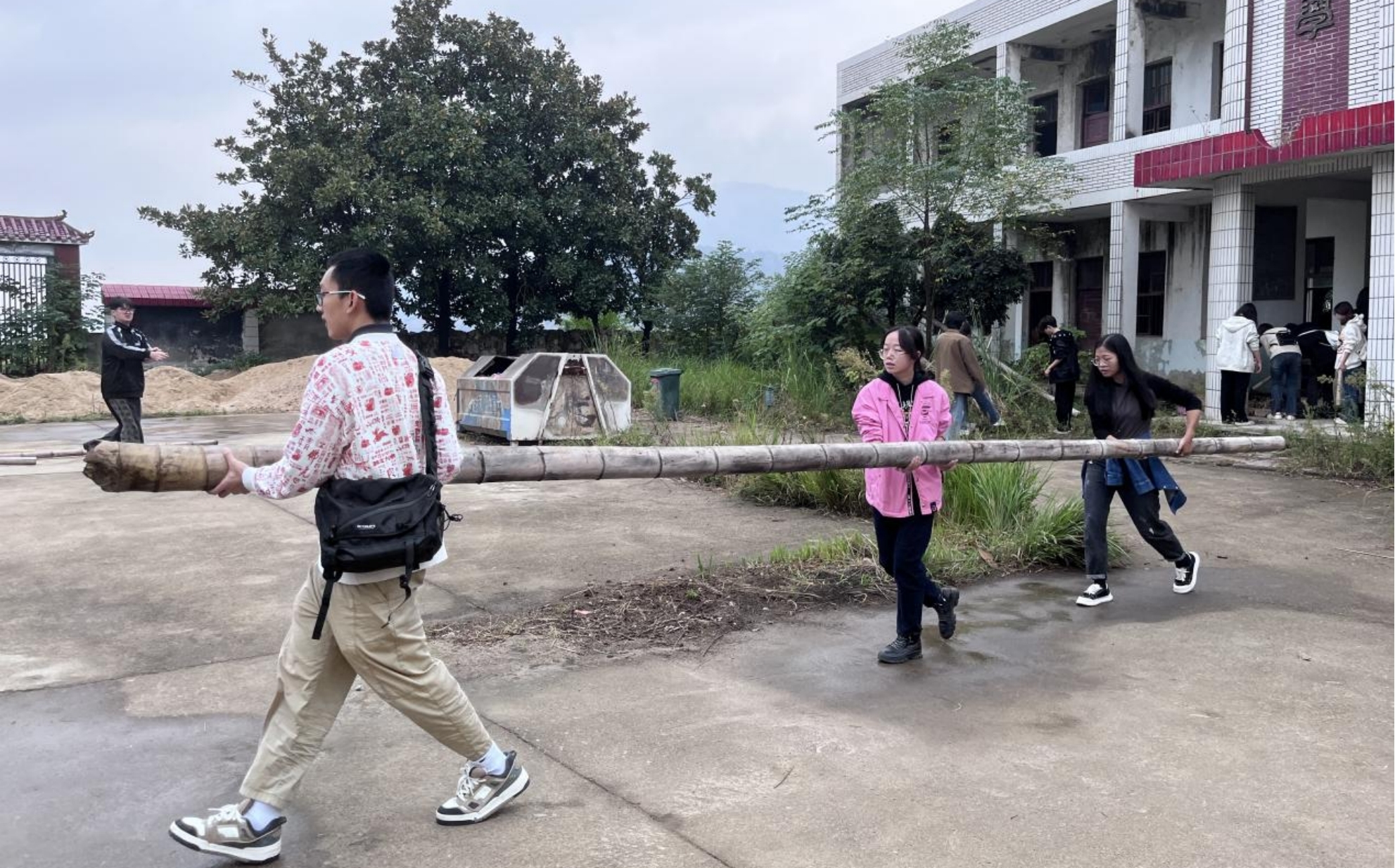 为了让同学们更直观地理解公共艺术策划的完整流程及乡土材料在公共艺术活动策划中的可应用性,老师引导同学们利用竹子和稻草共同创作一件公共艺术作品,并以此为核心策划一场村民、同学共同参与的田野篝火公共艺术活动。