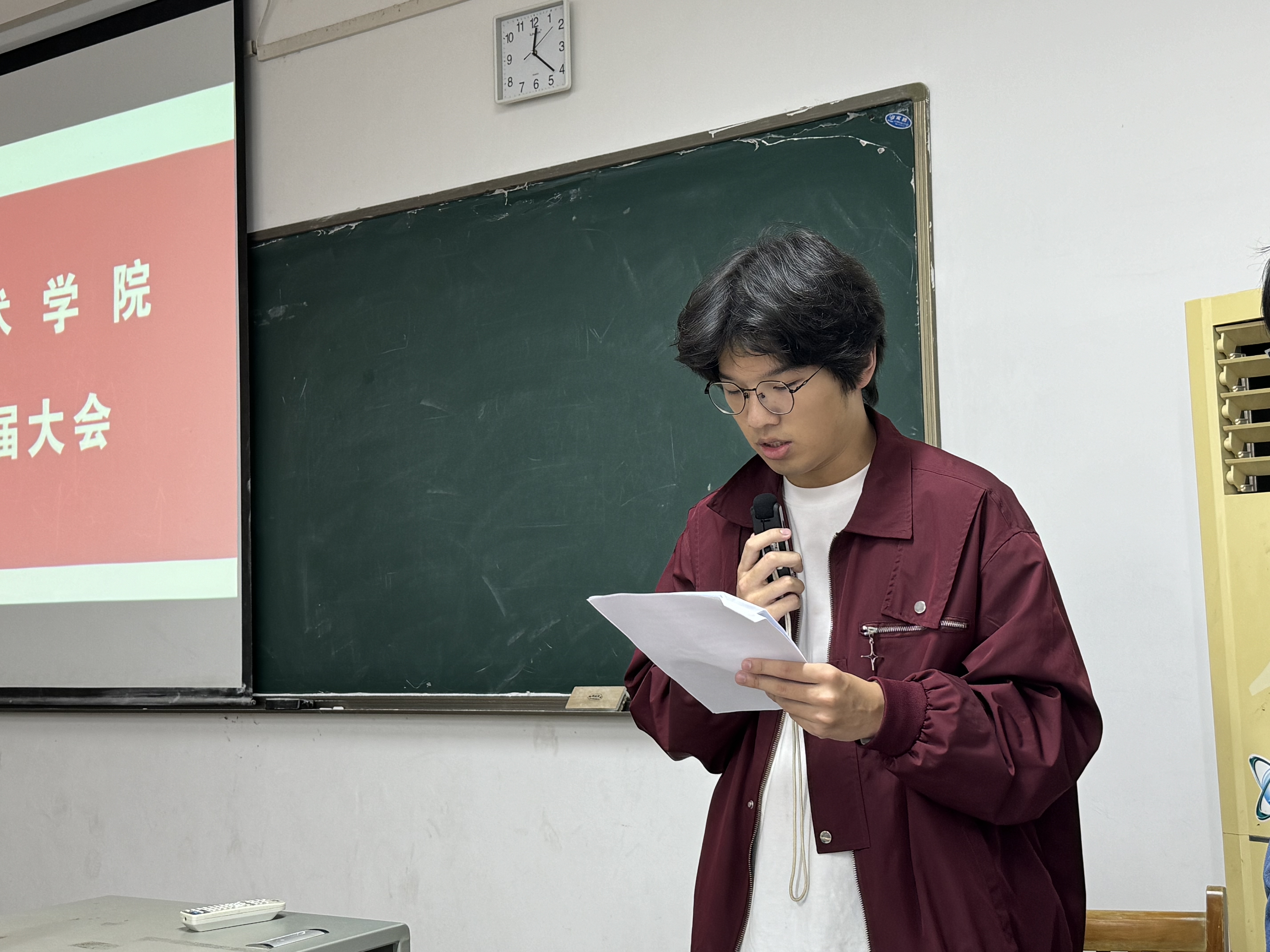 江忠颖老师在讲话中首先指出,去年在团委老师和各部负责人的领导下,学院取得了许多荣誉,如荣获五月花海比赛一等奖,强调了团队的努力和校园活动的丰富性,对学生会工作给予积极评价和期望,着重提到为学生会注入新活力、加强团队协作与相互支持。表达了对未来校园生活的美好展望,感谢团队的贡献与支持。