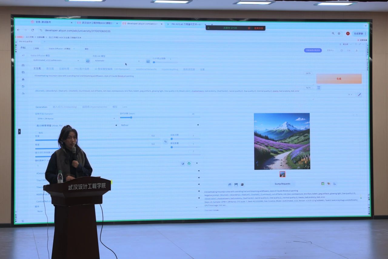 李易晓专家则带领我们进入了AIGC的入门实验环节。通过PAI ArtLab平台,她现场指导同学们完成了一个个有趣的AIGC小实验,并在过程中为大家答疑解惑。这样的互动式教学不仅让同学们对AIGC有了更直观的认识,也激发了同学们对新技术的兴趣和热情。