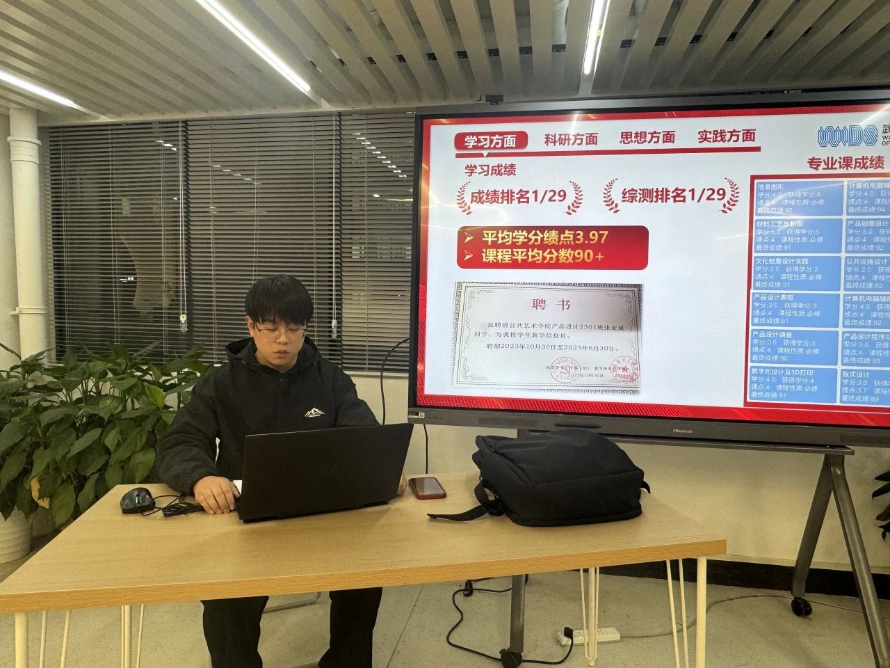 首先是产品设计(专升本)2301三好学生代表:张亚威同学为大家带来了一场精彩纷呈且干货满满的分享。他从学习、科研、思想、实践四个方面展开讲述。张亚威同学强调目标制定的重要性以及合理利用软件对学习的积极作用。通过对自己实地调研、创新创业与校内校外实践经验的介绍,鼓励同学们通过不断学习和参与社会实践来提升能力。最后,张亚威同学送给学弟学妹们一句充满力量与哲理的话语:“人生这份答卷,怎么答都是满分!”
