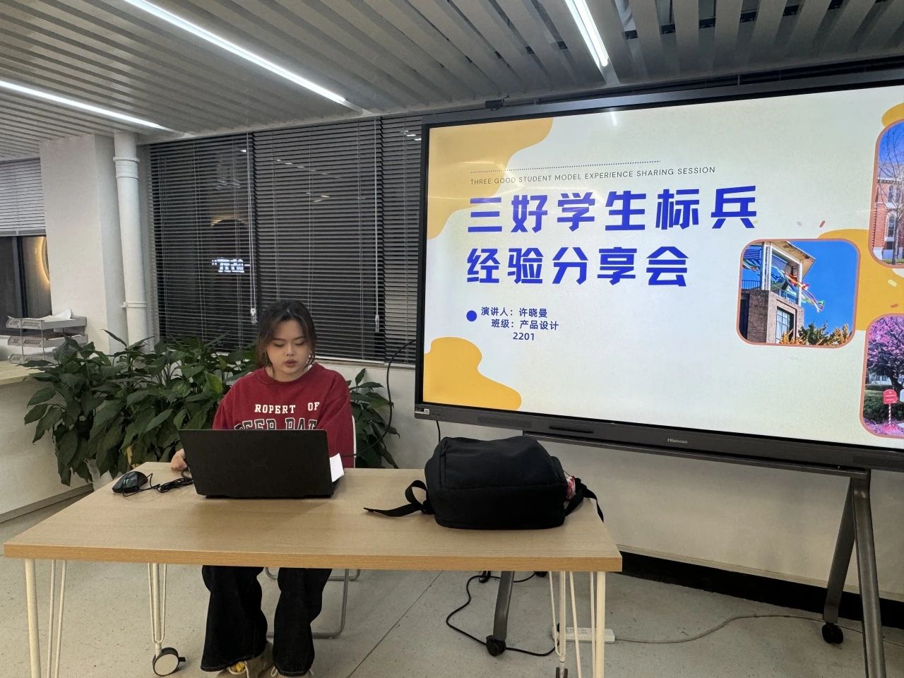 接下来,产品设计2201班的三好学生标兵许晓曼同学进行交流分享。她着重指出,制定合理的学习计划堪称学习的关键基石。在日常学业生活中,务必要始终秉持积极乐观的心态去迎接每一个挑战与机遇。而针对学科竞赛以及学校活动方面,她提出“多投入、多累积、多锻炼”这三大要点。许晓曼同学鼓励同学们要善于巧妙地合理规划时间,充分挖掘碎片化时间的价值。她还大力倡导同学们积极踊跃地参与学校举办的各类活动赛事,因为“趁年轻,多拓宽眼界”,这些丰富多元的活动不仅能够拓展同学们的视野边界,更能极大地丰富大家的知识储备,为未来的成长之路奠定更为坚实的基础。