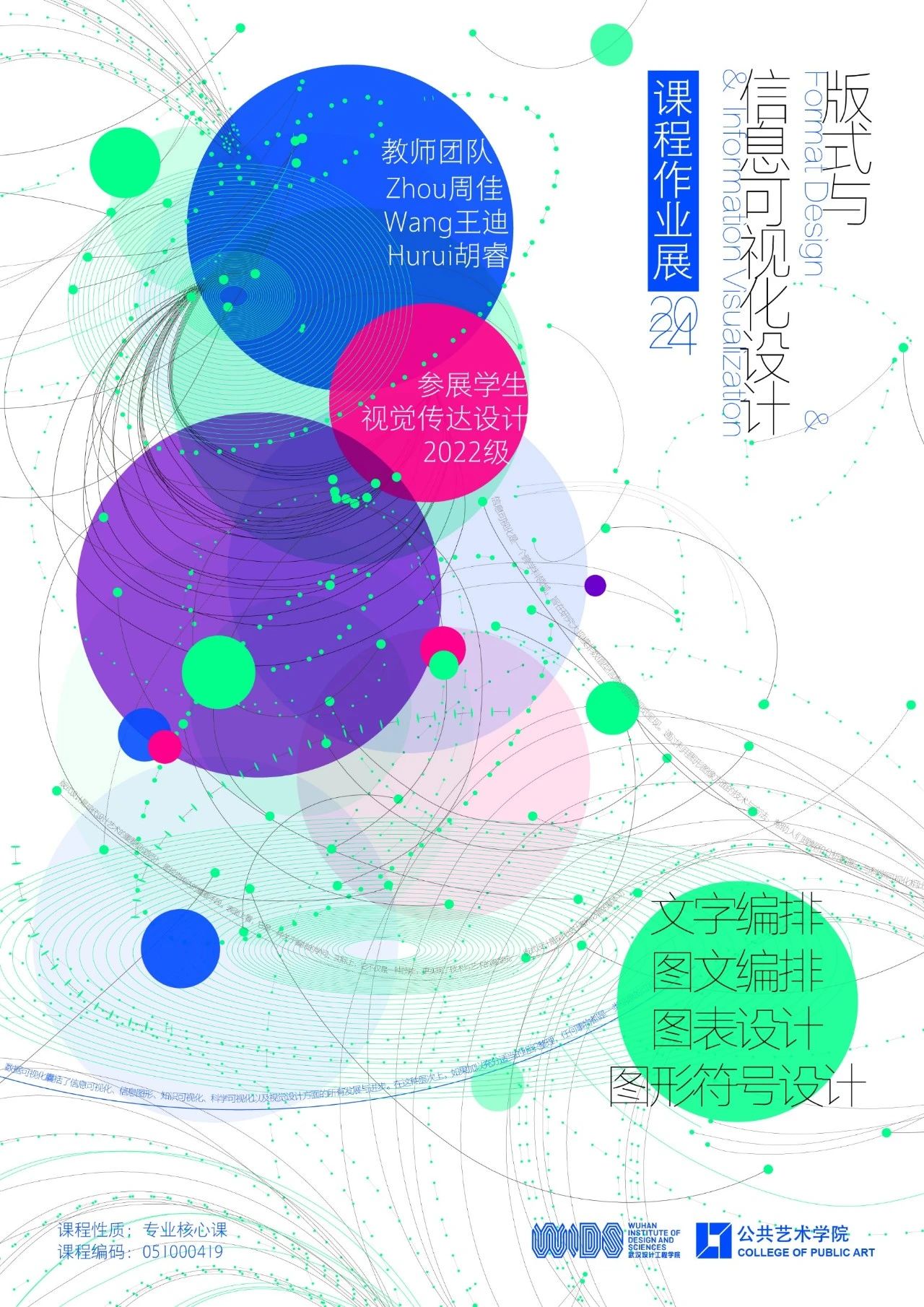 基本信息:《版式与信息可视化设计》是视觉传达设计专业的一门专业核心课程。课程是通过讲授、示范、案例分析、小组讨论、作业练习等多种教学形式,培养学生的版式设计和信息可视化设计的理论素养和实践能力。学习这门课程后,学生将能够掌握版式设计的原理和方法,信息可视化设计的概念和技巧,以及加强学生软件操作的技能。学生也将能够用信息可视化设计展示、提升版式设计的能力,以及对复杂信息的提炼、整合、归纳的能力。这门课程的目标是让学生用设计思维和技巧为信息传播、推广提供有效的解决方案,并为后续专业核心课程和创新创业项目提供技术和美学的支持。课程紧跟信息时代发展的新趋势和新技术,强调信息可视化设计不仅是一种信息再现的方法,更是信息传达的手段。这门课程的评估方式综合考查学生的平时表现、作业完成情况和期末项目展示,反映学生的学习效果和进步情况。最终通过课程教学环节和项目设计环节的学习,从而掌握信息可视化设计的思考方法、编辑能力和设计能力。