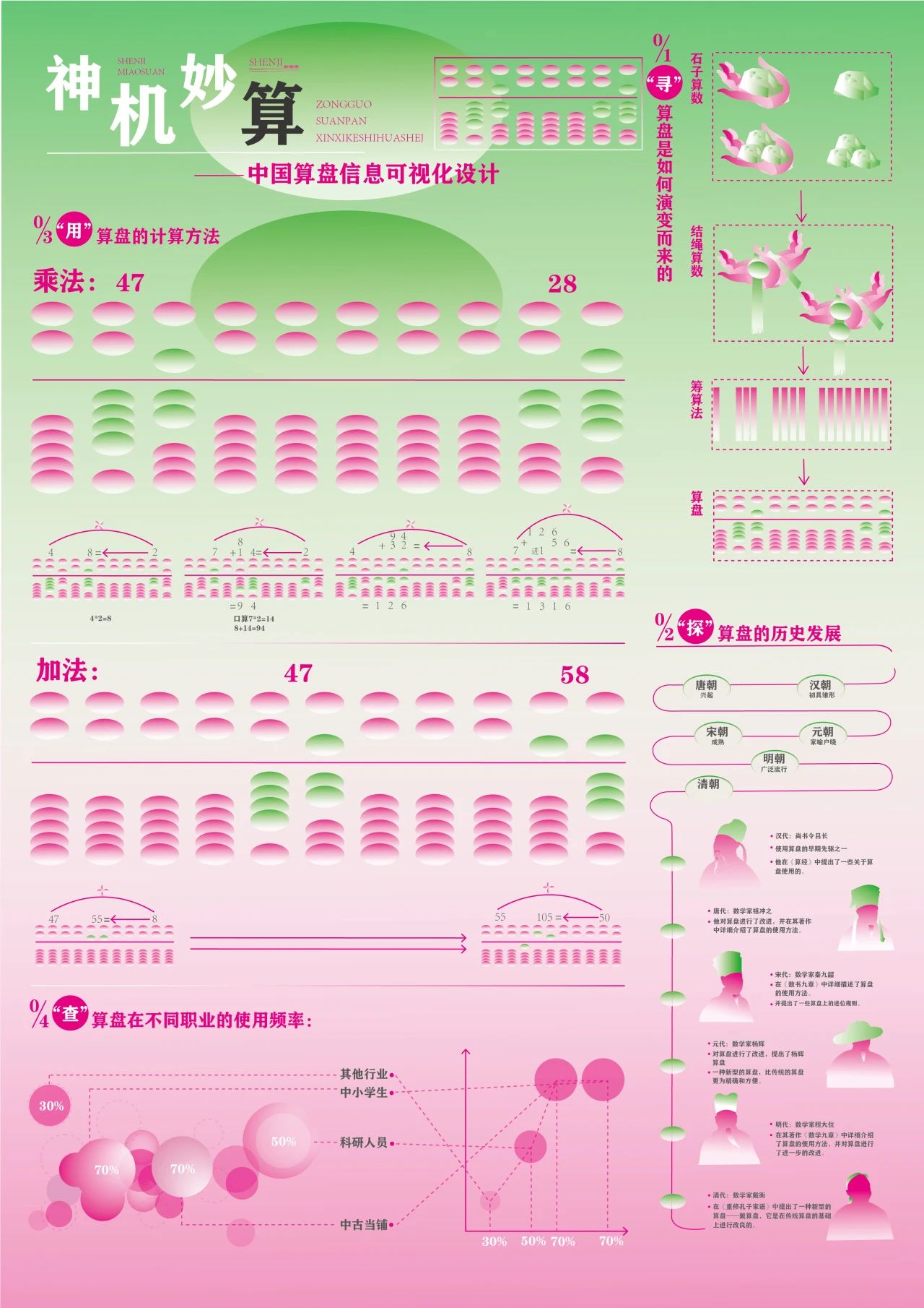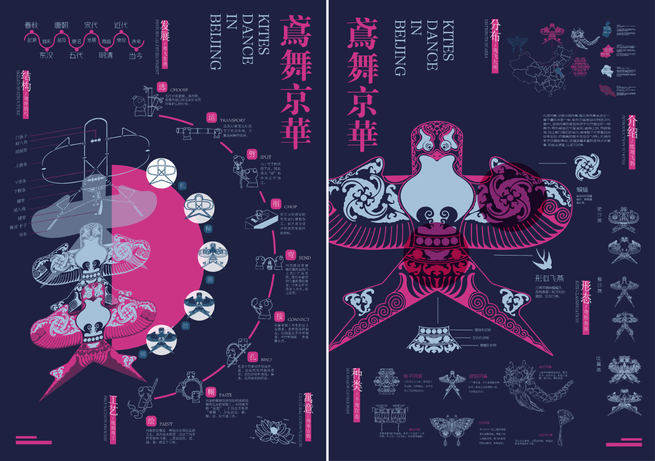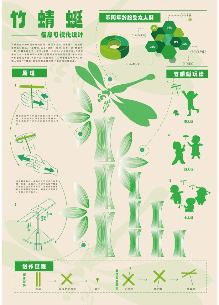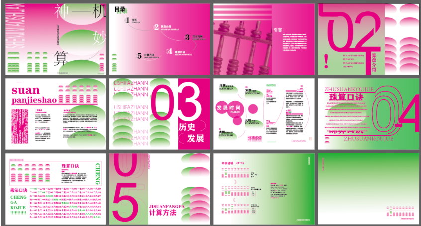 课程作业以中国传统文化为主题,聚焦传统玩具、传统武术、传统中医和古代数学四个方向。学生需通过了解、分析与研究相关内容,最终以信息可视化的形式进行呈现。作业旨在深化学生对中华优秀传统文化的认知与理解,鼓励他们结合文化、设计与科技等多个领域进行探索,提升跨学科思维能力与解决复杂问题的综合素养。通过将传统文化解构与重组为现代设计作品,作业引导学生挖掘传统文化的当代价值,增强文化自信,培育民族自豪感。